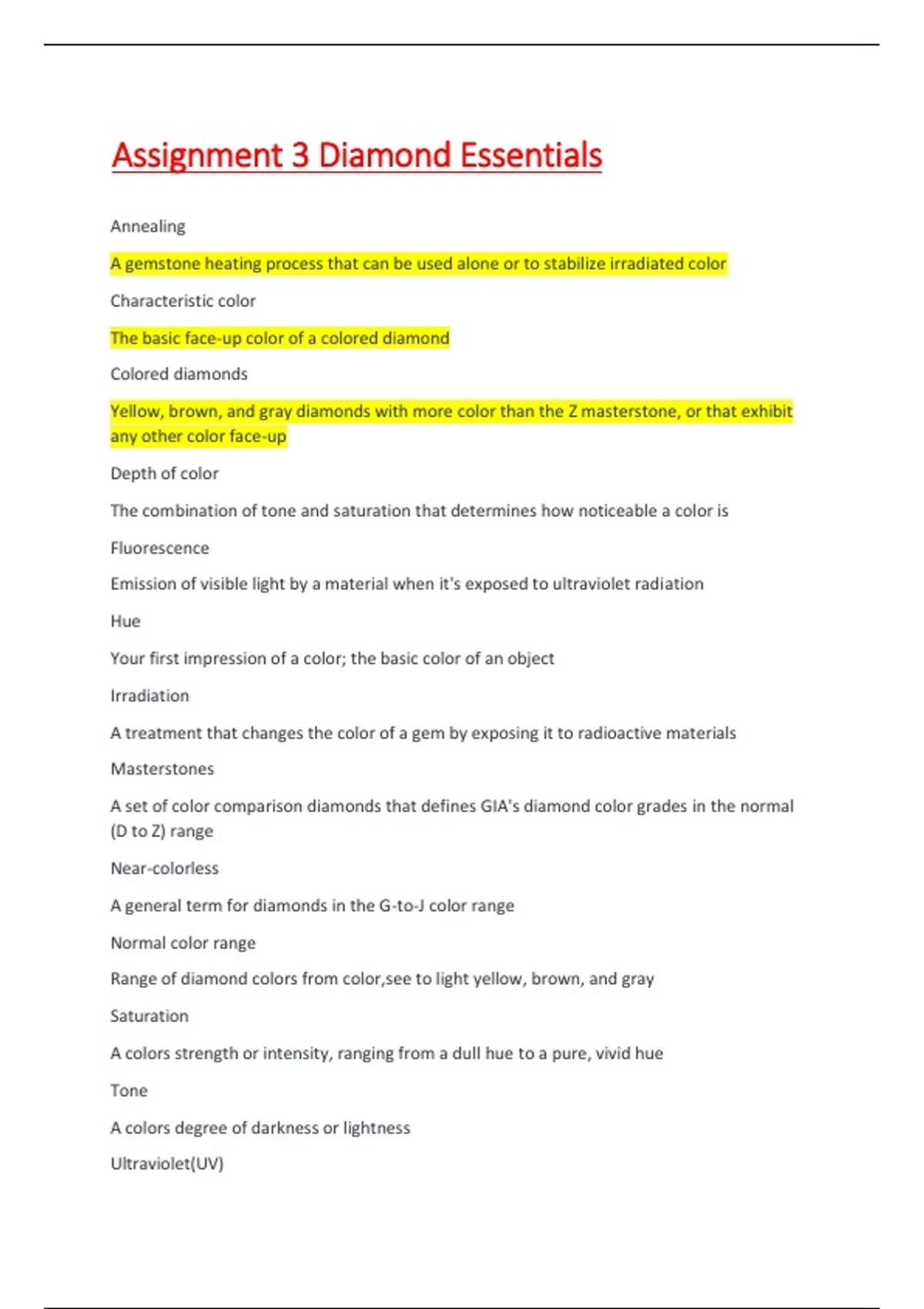 Yellow, brown, and gray diamonds with more color than the Z masterstone, or that exhibit any other color face-up Depth of color The combination of tone and saturation that determines how noticeable a color is Fluorescence Emission of visible light by a material when it's exposed to ultraviolet radiation Hue Your first impression of a color; the basic color of an object Irradiation A treatment that changes the color of a gem by exposing it to radioactive materials Masterstones