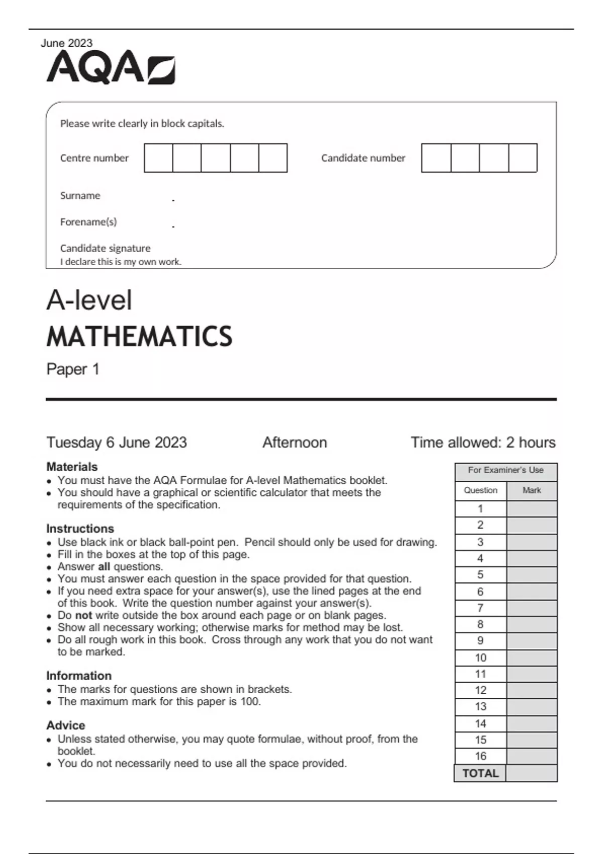 AQA MATHEMATICS Paper 1 June 2023