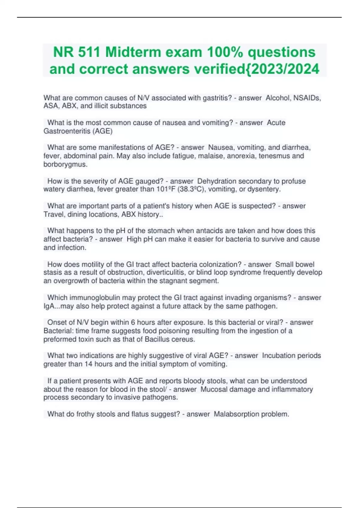NR 511 Midterm exam 100% questions and correct answers verified{2023/2024 What are common causes of N/V associated with gastritis? - answer Alcohol, NSAIDs, ASA, ABX, and illicit substances What is the most common cause of nausea and vomiting? - answer Acute Gastroenteritis (AGE) What are some manifestations of AGE? - answer Nausea, vomiting, and diarrhea, fever, abdominal pain. May also include fatigue, malaise, anorexia, tenesmus and borborygmus. How is the severity of AGE gauged? - answer Dehydration secondary to profuse watery diarrhea, fever greater than 101ºF (38.3ºC), vomiting, or dysentery. What are important parts of a patient's history when AGE is suspected? - answer Travel, dining locations, ABX history.. What happens to the pH of the stomach when antacids are taken and how does this affect bacteria? - answer High pH can make it easier for bacteria to survive and cause and infection. How does motility of the GI tract affect bacteria colonization? - answer Small bowel stasis as a result of obstruction, diverticulitis, or blind loop syndrome frequently develop an overgrowth of bacteria within the stagnant segment. Which immunoglobulin may protect the GI tract against invading organisms? - answer IgA...may also help protect against a future attack by the same pathogen. Onset of N/V begin within 6 hours after exposure. Is this bacterial or viral? - answer Bacterial: time frame suggests food poisoning resulting from the ingestion of a preformed toxin such as that of Bacillus cereus. What two indications are highly suggestive of viral AGE? - answer Incubation periods greater than 14 hours and the initial symptom of vomiting. If a patient presents with AGE and reports bloody stools, what can be understood about the reason for blood in the stool/ - answer Mucosal damage and inflammatory process secondary to invasive pathogens. What do frothy stools and flatus suggest? - answer Malabsorption problem. Patients with prolonged AGE illness who are malnourished may present with edema. What is the reason? - answer Hypoalbuminemia T or F: Chronic diarrhea usually has a noninfectious etiology. - answer True T or F: Acute diarrhea usually is caused by infectious agents or toxins - answer True What is the most common viral pathogen causing AGE in adults? - answer Norovirus What is the most common viral pathogen causing AGE in pediatrics? - answer Rotavirus. This has been greatly reduced since the introduction of the rotavirus vaccine. T or F: Stool studies are indicated in the absence of bloody diarrhea or systemic disease - answer False T or F: A CBC will help distinguish between viral and bacterial AGE - answer False When are stool studies warranted? - answer Severe or prolonged diarrhea, a fever > 38.5ºC, bloody stools or stools that test positive for leukocytes or occult blood. What are common pathogens involved in Traveler's Diarrhea? - answer Shigella, Campylobacter, and E. coli. What should the clinician do if the patient develops diarrhea after initiation of completion of antibiotic therapy? - answer Test for C. diff. What are some DDx of AGE, particularly in patients with persistent or chronic diarrhea and severe abdominal pain? - answer IBS, IBD, ischemic bowel disease, partial bowel obstruction, small bowel diverticulosis. What are some red flag symptoms that may indicate the need for hospitalization? - answer Hypovolemia, dehydration, abnormal electrolytes, decreased renal function, bloody stool/rectal bleeding, weight loss, severe abdominal pain, prolonged symptoms greater than 1 week, pregnancy, advanced age, history of hospitalization or antibiotic use in the last 3-6 months. What is the usual course of treatment for AGE? - answer Only supportive treatment is initiated since AGE is usually self-limiting and resolves within 1 week after onset of symptoms. How such patients with evidence of dehydration be treated initially? - answer Fluid repletion and nutrition. Sports drinks aren't as effective as specific electrolyte replenishing drinks. At what point should a patient be referred to the hospital for dehydration? - answer Signs of hypovolemia such as hypotension, tachycardia, pallor, and poor skin turgor. T of F: Empiric antimicrobial therapy is recommended for patients with severe diarrhea suspected form traveling. - answer True. Bactrim, Ciprofloxacin, Norfloxacin, Floxacin. T or F: Antibiotic prophylaxis for patients traveling to high-risk areas is appropriate. - answer True How effective is antibiotic prophylaxis for patients traveling to high-risk areas? - answer 90% effective What does antibiotic prophylaxis treatment consist of? - answer Bactrim, Ciprofloxacin, Norfloxacin, or Floxacin given once daily until 2 days after returning home. What is an appropriate symptomatic treatment for patients < 65 years or age with moderate to sev