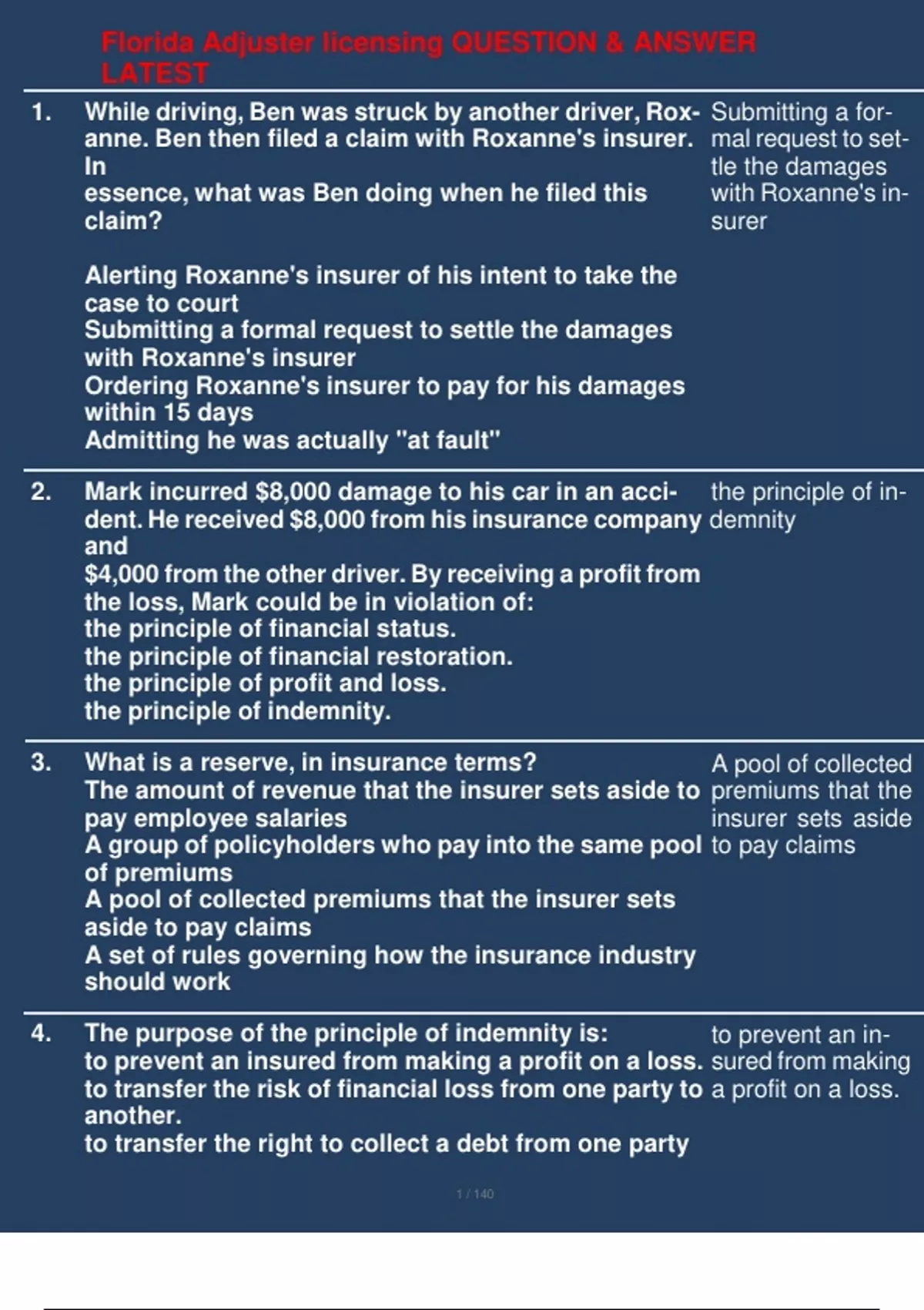 1. While driving, Ben was struck by another driver, Rox- anne. Ben then filed a claim with Roxanne's insurer. In essence, what was Ben doing when he filed this claim? Alerting Roxanne's insurer of his intent to take the case to court Submitting a formal request to settle the damages with Roxanne's insurer Ordering Roxanne's insurer to pay for his damages within 15 days Admitting he was actually "at fault" 2. Mark incurred $8,000 damage to his car in an acci- Submitting a for- mal request to set- tle the damages with Roxanne's in- surer the principle of in- dent. He received $8,000 from his insurance company demnity and $4,000 from the other driver. By receiving a profit from the loss, Mark could be in violation of: the principle of financial status. the principle of financial restoration. the principle of profit and loss. the principle of indemnity. 3. What is a reserve, in insurance terms? The amount of revenue that the insurer sets aside to pay employee salaries A group of policyholders who pay into the same pool of premiums A pool of collected premiums that the insurer sets aside to pay claims A set of rules governing how the insurance industry should work 4. The purpose of the principle of indemnity is: to prevent an insured from making a profit on a loss. to transfer the risk of financial loss from one party to another. to transfer the right to collect a debt from one party A pool of collected premiums that the insurer sets aside to pay claims to prevent an in- sured from making a profit on a loss. to another. to prevent an insurer from making a profit on a loss. 5. Greg plays trombone in his school band during foot- ball games. During a rally song in the stands one day, Greg annoys one of the opposing team's fans, who grabs his $400 trombone and hurls it down the bleachers, completely destroying it. Greg's insurance pays him $400 to replace the trombone, but then the opposing team's coach also offers to replace the in- strument, at whatever the cost. So Greg orders a new $3,200 trombone and has the opposing team's athlet- ic department absorb the cost. Which principle has Greg violated? The principle of consideration The principle of legal purpose The principal of the opposing team The principle of indemnity 6. Which of the following refers to being restored to the financial condition you were in before a loss? Indemnification Restoration Estoppel Subrogation 7. Bobby just purchased an insurance policy for his home from XYZ Insurance. Which of the following would be a reason this policy may not be legally binding? Bobby has an outstanding warrant for selling mari- juana. Bobby has been diagnosed with schizophrenia. Bobby paid his first premium when he and his agent agreed on a policy, but he is waiting for the policy documents to be prepared so he can sign them Bobby is only 19 years old. The principle of in- demnity Indemnification Bobby has been diagnosed with schizophrenia. 8. Indemnification may include all of the following ex- cept: reimbursement for hotel costs. reimbursement for rental car costs. payment for pain and suffering. payment for repairs to property. 9. Which of the following is NOT a requirement for a legally binding contract? There must be a legal purpose. There must be mutual consent. Both parties must bring something of value. It must be a notarized document. 10. The fee paid by the insured in exchange for an insur- ance policy is called a: premium. legal purpose. binder. contract. 11. Which of the following best defines the principle of indemnity? Both parties to an insurance contract must contribute something of value. After a loss, the insured should be restored to his approximate financial condition before the loss. In order to be legally binding, a contract must have agreement, consideration, competent parties, and legal purpose. In exchange for a premium, the insurer grants peace of mind by reducing the insured's insecurity about the future. 12. Which of the following is found in the declarations page of an insurance policy? The perils insured against A description of how to file a claim