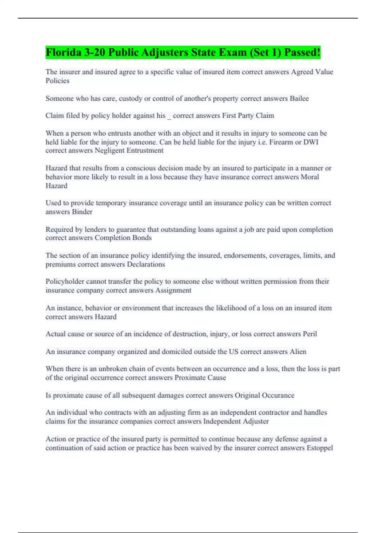 Florida 3-20 Public Adjusters State Exam (Set 1) Passed!