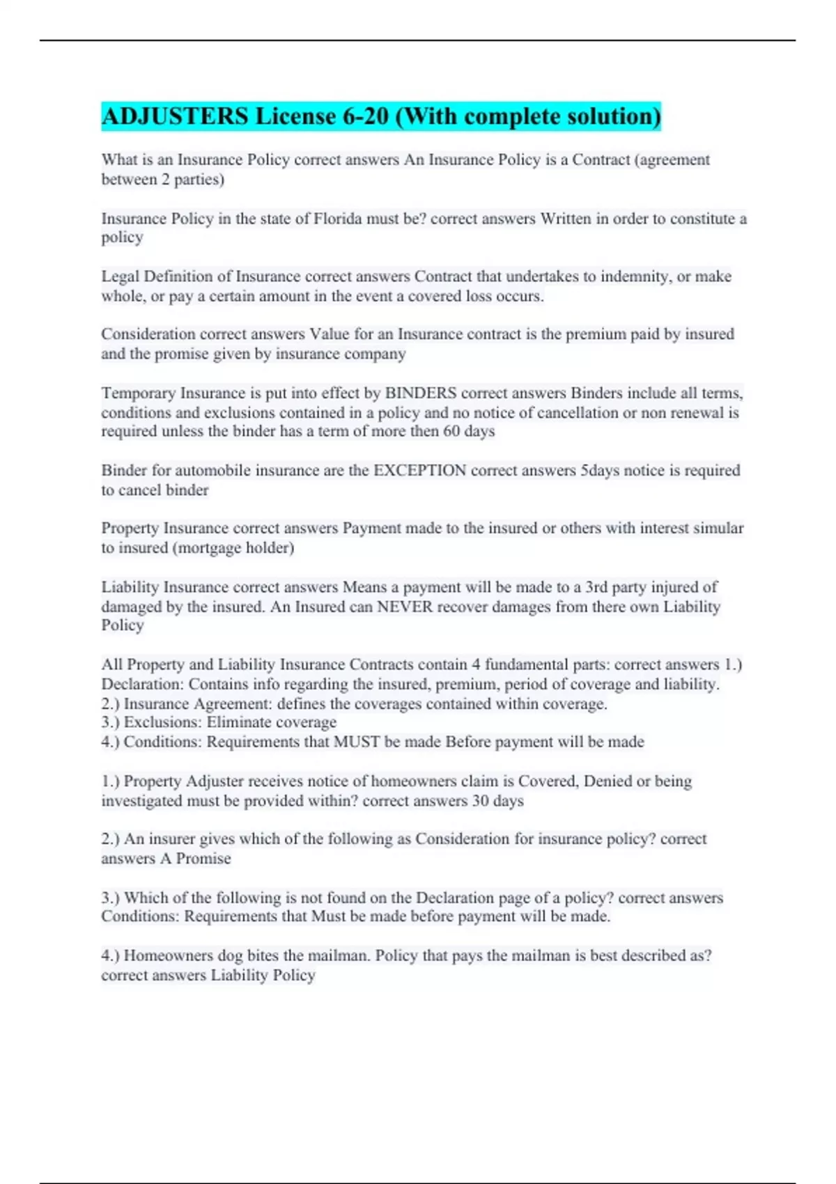 What is an Insurance Policy correct answers An Insurance Policy is a Contract (agreement between 2 parties) Insurance Policy in the state of Florida must be? correct answers Written in order to constitute a policy Legal Definition of Insurance correct answers Contract that undertakes to indemnity, or make whole, or pay a certain amount in the event a covered loss occurs. Consideration correct answers Value for an Insurance contract is the premium paid by insured and the promise given by insurance company Temporary Insurance is put into effect by BINDERS correct answers Binders include all terms, conditions and exclusions contained in a policy and no notice of cancellation or non renewal is required unless the binder has a term of more then 60 days Binder for automobile insurance are the EXCEPTION correct answers 5days notice is required to cancel binder Property Insurance correct answers Payment made to the insured or others with interest simular to insured (mortgage holder) Liability Insurance correct answers Means a payment will be made to a 3rd party injured of damaged by the insured. An Insured can NEVER recover damages from there own Liability Policy All Property and Liability Insurance Contracts contain 4 fundamental parts: correct answers 1.) Declaration: Contains info regarding the insured, premium, period of coverage and liability. 2.) Insurance Agreement: defines the coverages contained within coverage. 3.) Exclusions: Eliminate coverage 4.) Conditions: Requirements that MUST be made Before payment will be made 1.) Property Adjuster receives notice of homeowners claim is Covered, Denied or being investigated must be provided within? correct answers 30 days 2.) An insurer gives which of the following as Consideration for insurance policy? correct answers A Promise 3.) Which of the following is not found on the Declaration page of a policy? correct answers Conditions: Requirements that Must be made before payment will be made. 4.) Homeowners dog bites the mailman. Policy that pays the mailman is best described as? correct answers Liability Policy