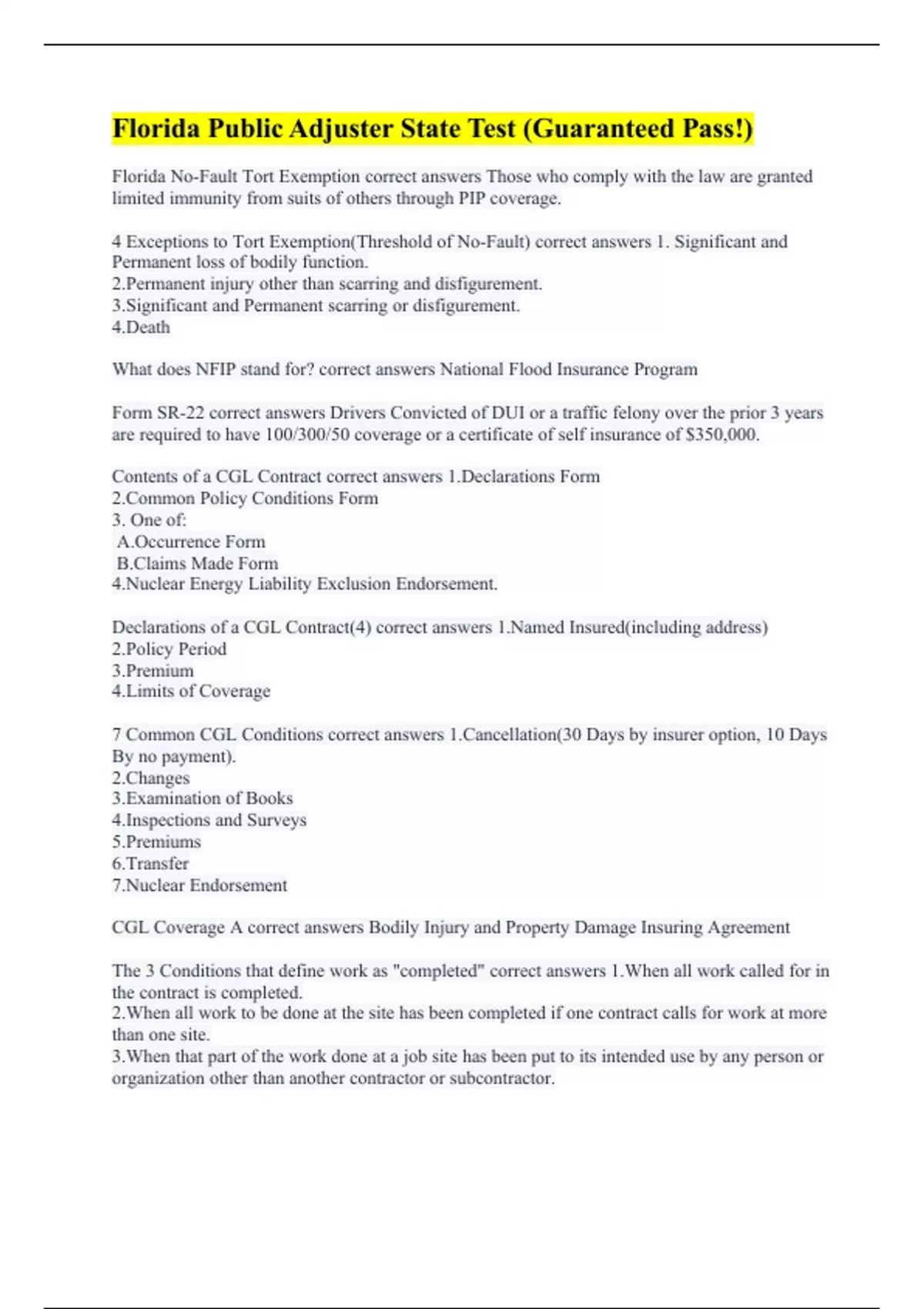 Florida No-Fault Tort Exemption correct answers Those who comply with the law are granted limited immunity from suits of others through PIP coverage. 4 Exceptions to Tort Exemption(Threshold of No-Fault) correct answers 1. Significant and Permanent loss of bodily function. 2.Permanent injury other than scarring and disfigurement. 3.Significant and Permanent scarring or disfigurement. 4.Death What does NFIP stand for? correct answers National Flood Insurance Program Form SR-22 correct answers Drivers Convicted of DUI or a traffic felony over the prior 3 years are required to have 100/300/50 coverage or a certificate of self insurance of $350,000. Contents of a CGL Contract correct answers 1.Declarations Form 2.Common Policy Conditions Form 3. One of: A.Occurrence Form B.Claims Made Form 4.Nuclear Energy Liability Exclusion Endorsement. Declarations of a CGL Contract(4) correct answers 1.Named Insured(including address) 2.Policy Period 3.Premium 4.Limits of Coverage 7 Common CGL Conditions correct answers 1.Cancellation(30 Days by insurer option, 10 Days By no payment). 2.Changes 3.Examination of Books 4.Inspections and Surveys 5.Premiums 6.Transfer 7.Nuclear Endorsement CGL Coverage A correct answers Bodily Injury and Property Damage Insuring Agreement The 3 Conditions that define work as "completed" correct answers 1.When all work called for in the contract is completed. 2.When all work to be done at the site has been completed if one contract calls for work at more than one site. 3.When that part of the work done at a job site has been put to its intended use by any person or organization other than another contractor or subcontractor.
