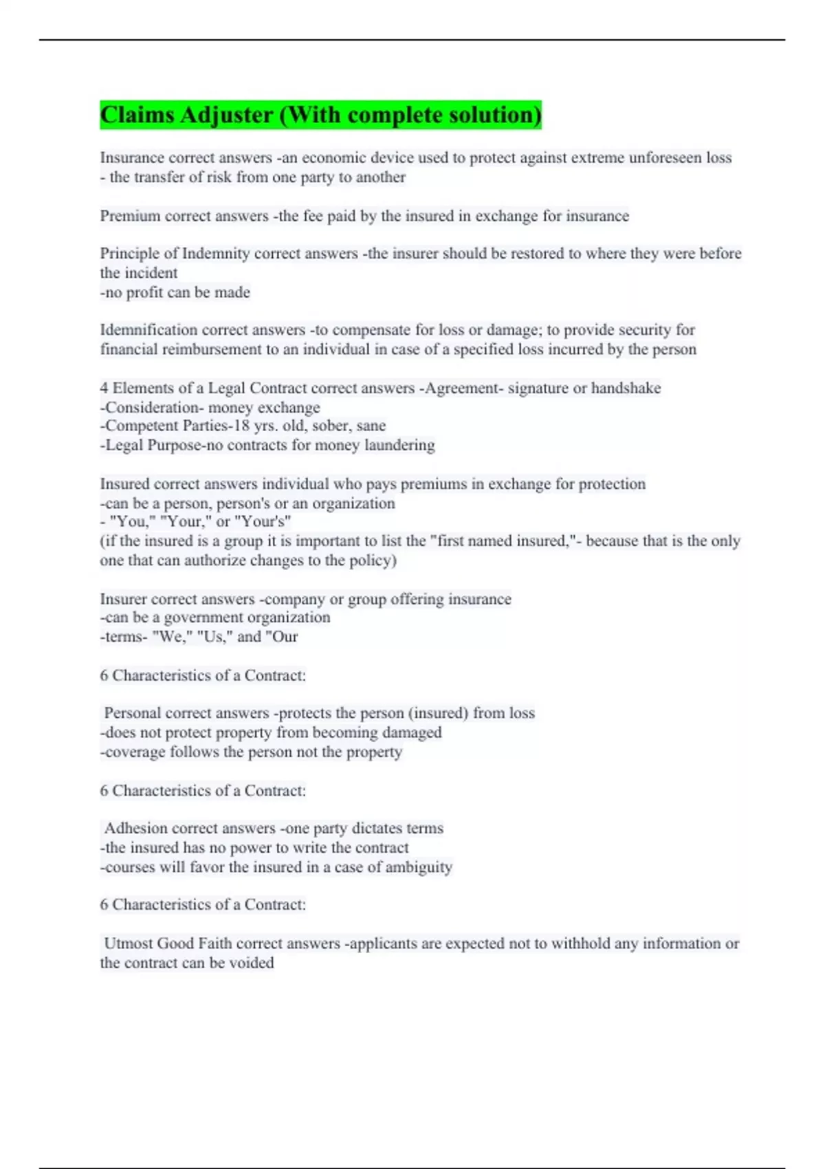Insurance correct answers -an economic device used to protect against extreme unforeseen loss - the transfer of risk from one party to another Premium correct answers -the fee paid by the insured in exchange for insurance Principle of Indemnity correct answers -the insurer should be restored to where they were before the incident -no profit can be made Idemnification correct answers -to compensate for loss or damage; to provide security for financial reimbursement to an individual in case of a specified loss incurred by the person 4 Elements of a Legal Contract correct answers -Agreement- signature or handshake -Consideration- money exchange -Competent Parties-18 yrs. old, sober, sane -Legal Purpose-no contracts for money laundering Insured correct answers individual who pays premiums in exchange for protection -can be a person, person's or an organization - "You," "Your," or "Your's" (if the insured is a group it is important to list the "first named insured,"- because that is the only one that can authorize changes to the policy) Insurer correct answers -company or group offering insurance -can be a government organization -terms- "We," "Us," and "Our 6 Characteristics of a Contract: Personal correct answers -protects the person (insured) from loss -does not protect property from becoming damaged -coverage follows the person not the property 6 Characteristics of a Contract: Adhesion correct answers -one party dictates terms -the insured has no power to write the contract -courses will favor the insured in a case of ambiguity 6 Characteristics of a Contract: Utmost Good Faith correct answers -applicants are expected not to withhold any information or the contract can be voided