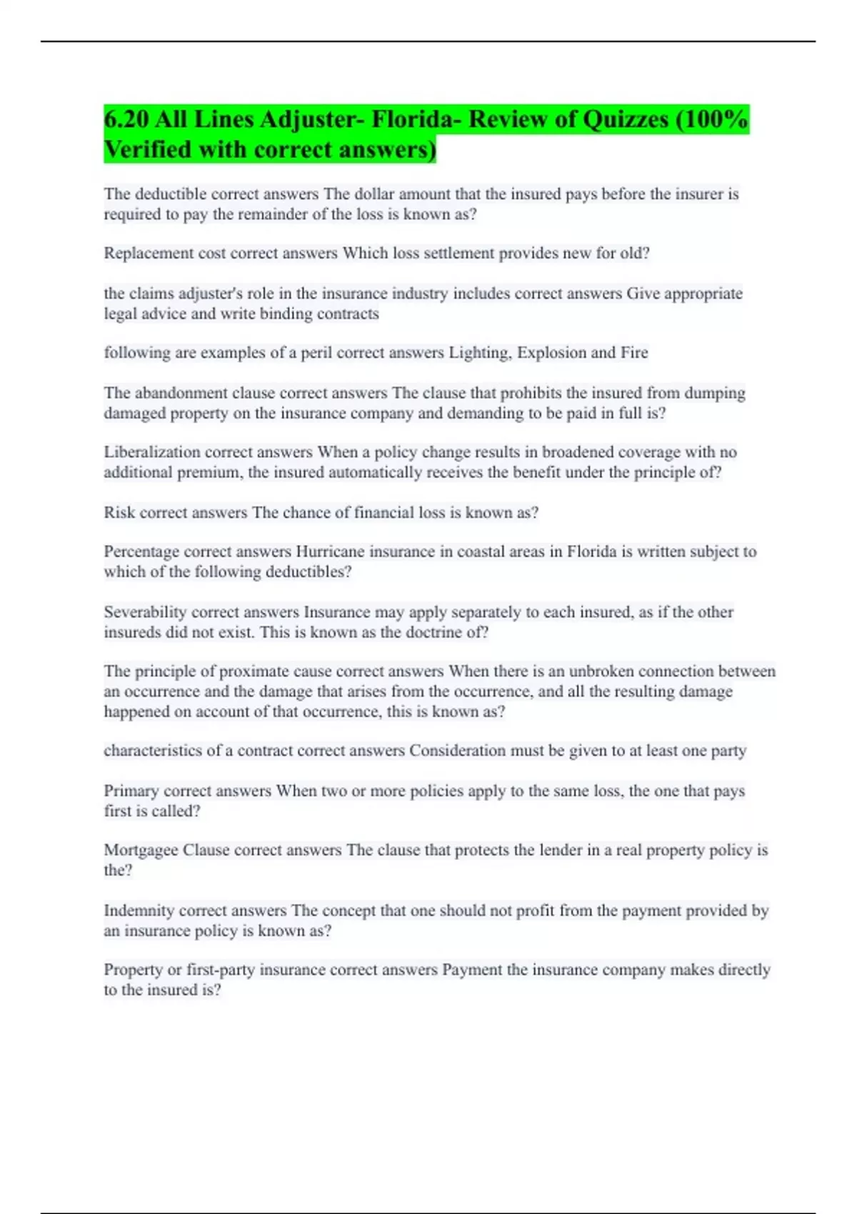 6.20 All Lines Adjuster- Florida- Review of Quizzes (100% Verified with correct answers)