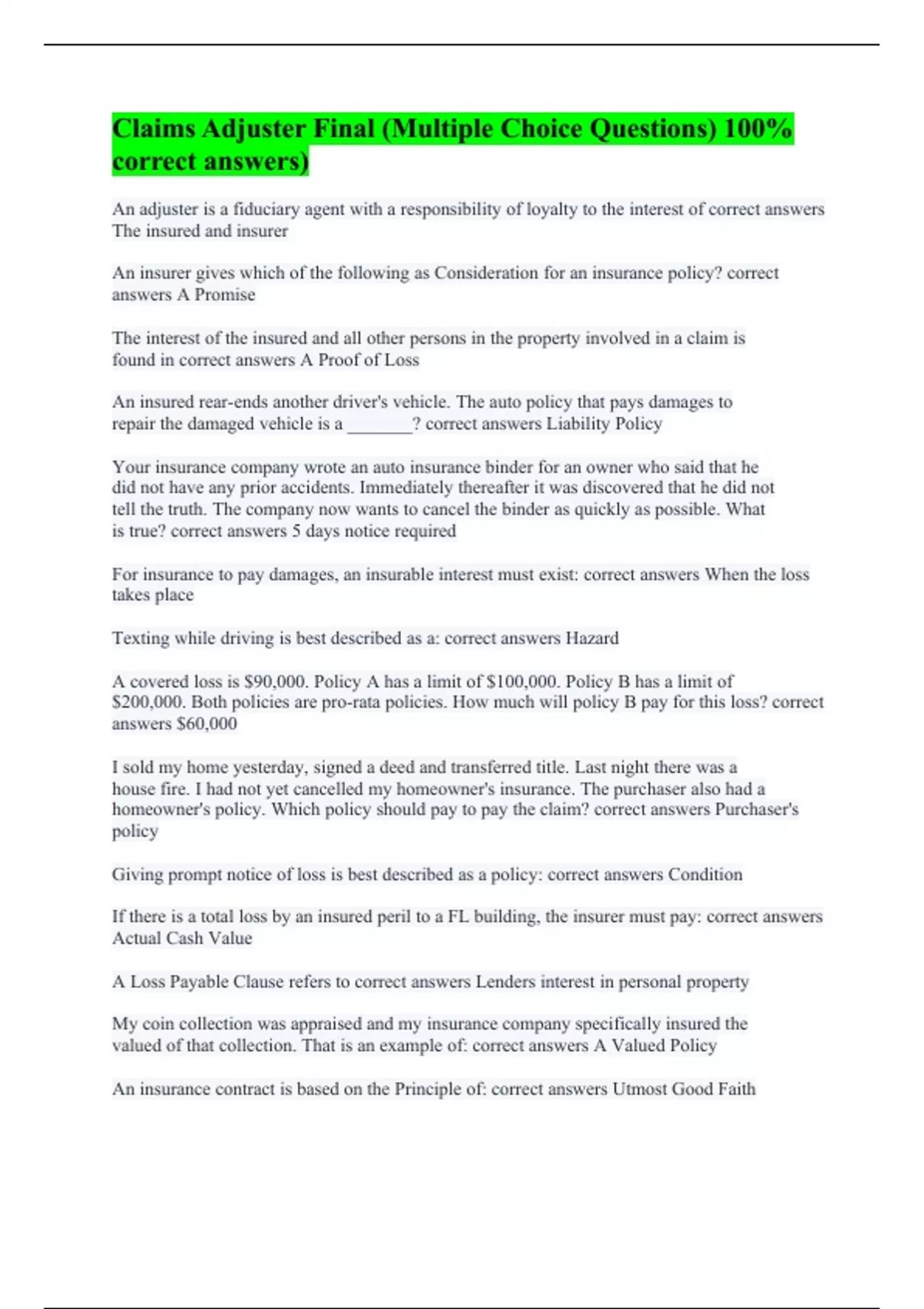 Claims Adjuster Final (Multiple Choice Questions) 100% correct answers)