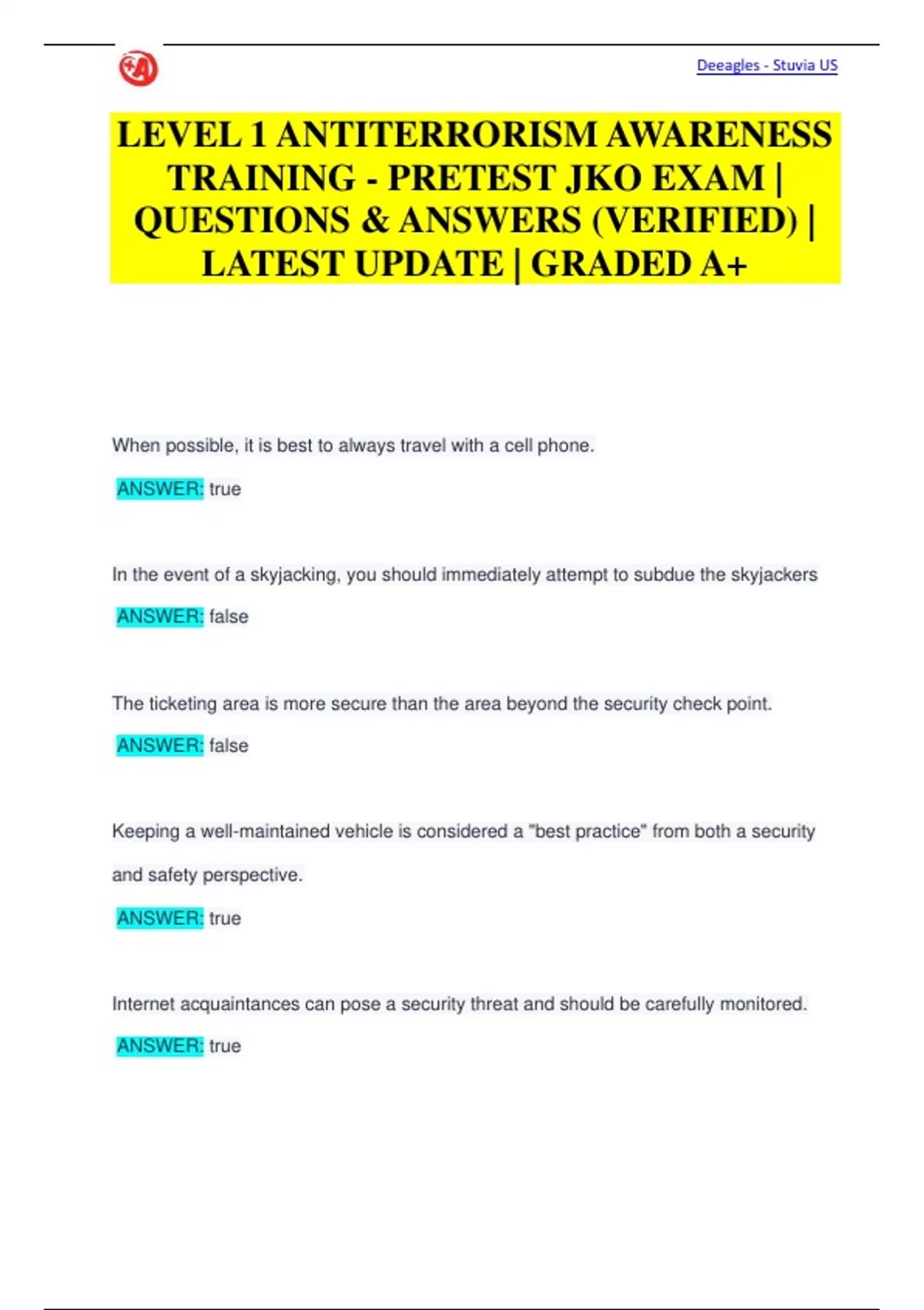 VLEVEL 1 ANTITERRORISM AWARENESS TRAINING - PRETEST JKO EXAM | QUESTIONS & ANSWERS (VERIFIED) | LATEST UPDATE | GRADED A+