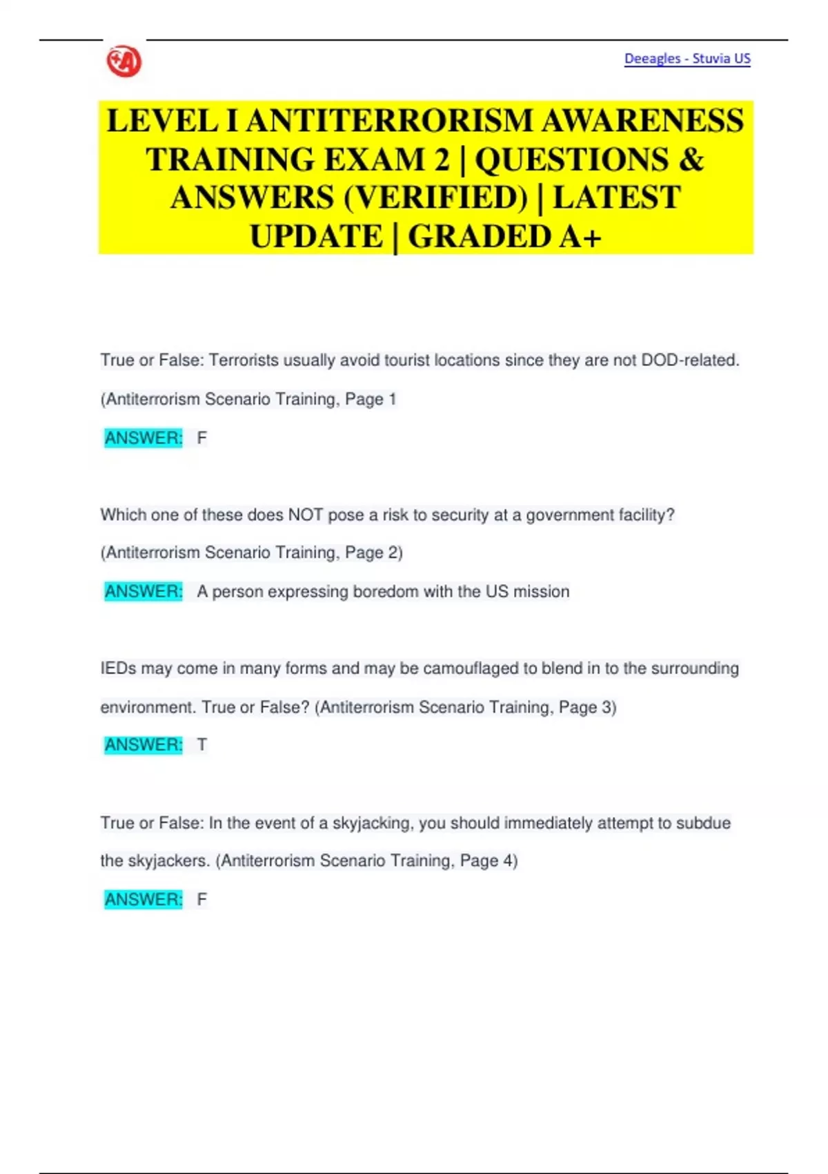 LEVEL I ANTITERRORISM AWARENESS TRAINING EXAM 2 | QUESTIONS & ANSWERS (VERIFIED) | LATEST UPDATE | GRADED A+