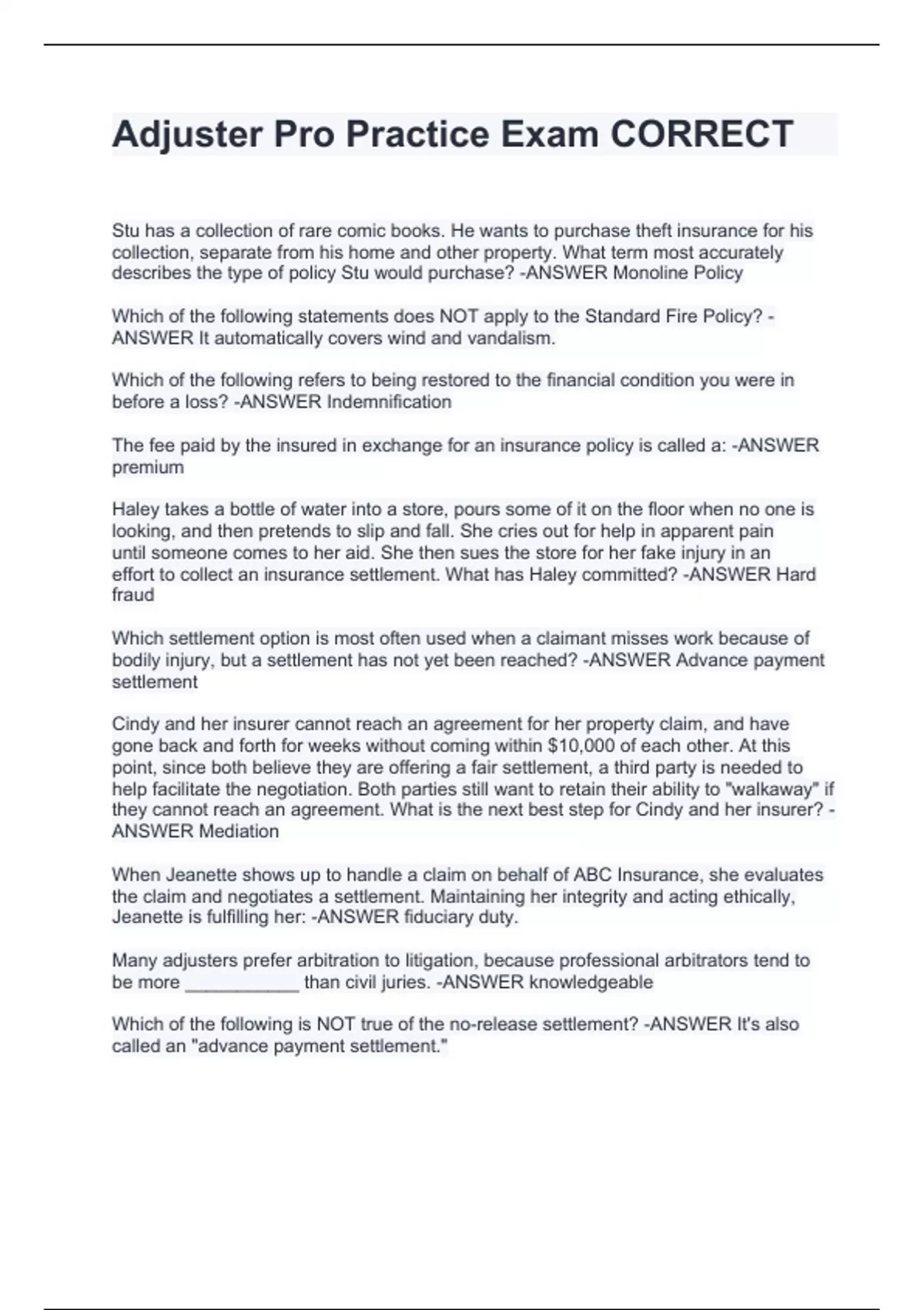 Stu has a collection of rare comic books. He wants to purchase theft insurance for his collection, separate from his home and other property. What term most accurately describes the type of policy Stu would purchase? -ANSWER Monoline Policy of the following statements does NOT apply to the Standard Fire Policy? - Which ANSWER It automatically covers wind and vandalism. Which of the following refers to being restored to the financial condition you were in before a loss? -ANSWER Indemnification The fee paid by the insured in exchange for an insurance policy is called a: -ANSWER premium Haley takes a bottle of water into a store, pours some of it on the floor when no one is looking, and then pretends to slip and fall. She cries out for help in apparent pain until someone comes to her aid. She then sues the store for her fake injury in an effort to collect an insurance settlement. What has Haley committed? -ANSWER Hard fraud Which settlement option is most often used when a claimant misses work because of bodily injury, but a settlement has not yet been reached? -ANSWER Advance payment settlement Cindy and her insurer cannot reach an agreement for her property claim, and have gone back and forth for weeks without coming within $10,000 of each other. At this point, since both believe they are offering a fair settlement, a third party is needed to help facilitate the negotiation. Both parties still want to retain their ability to "walkaway" if they cannot reach an agreement. What is the next best step for Cindy and her insurer? -ANSWER Mediation When Jeanette shows up to handle a claim on behalf of ABC Insurance, she evaluates the claim and negotiates a settlement. Maintaining her integrity and acting ethically, Jeanette is fulfilling her: -ANSWER fiduciary duty. Many adjusters prefer arbitration to litigation, because professional arbitrators tend to be more ___________ than civil juries. -ANSWER knowledgeable Which of the following is NOT true of the no-release settlement? -ANSWER It's also called an "advance payment settlement." Why should litigation be considered a last resort option? -ANSWER It can be costly and unpredict