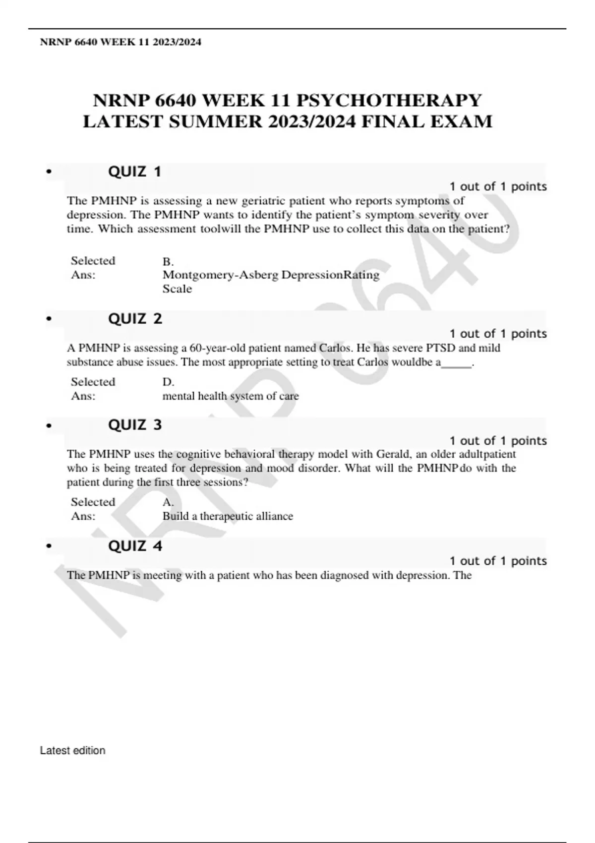 NRNP 6640 WEEK 11 PSYCHOTHERAPY LATEST SUMMER 2023/2024 FINAL EXAM