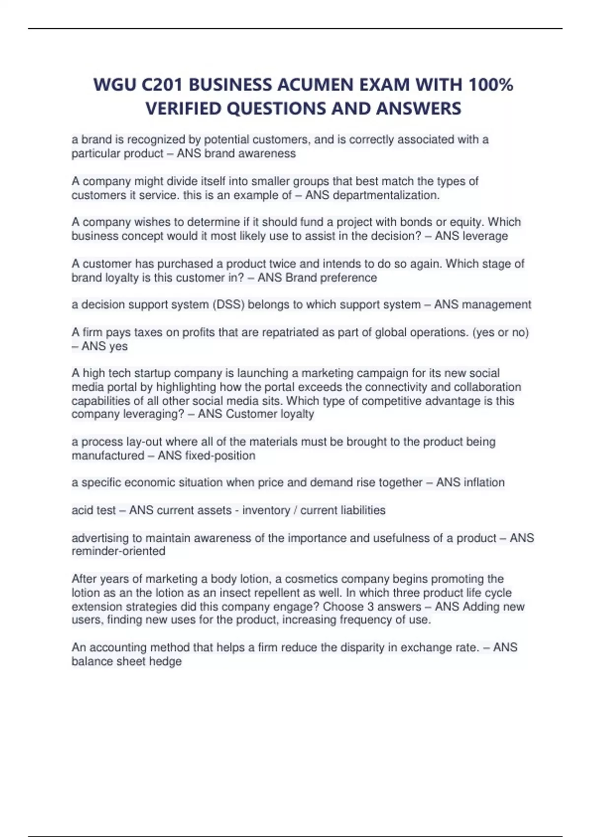 WGU C201 BUSINESS ACUMEN EXAM WITH 100% VERIFIED QUESTIONS AND ANSWERSWGU C201 BUSINESS ACUMEN EXAM WITH 100% VERIFIED QUESTIONS AND ANSWERS,WGU C201 BUSINESS ACUMEN EXAM WITH 100% VERIFIED QUESTIONS AND ANSWERS