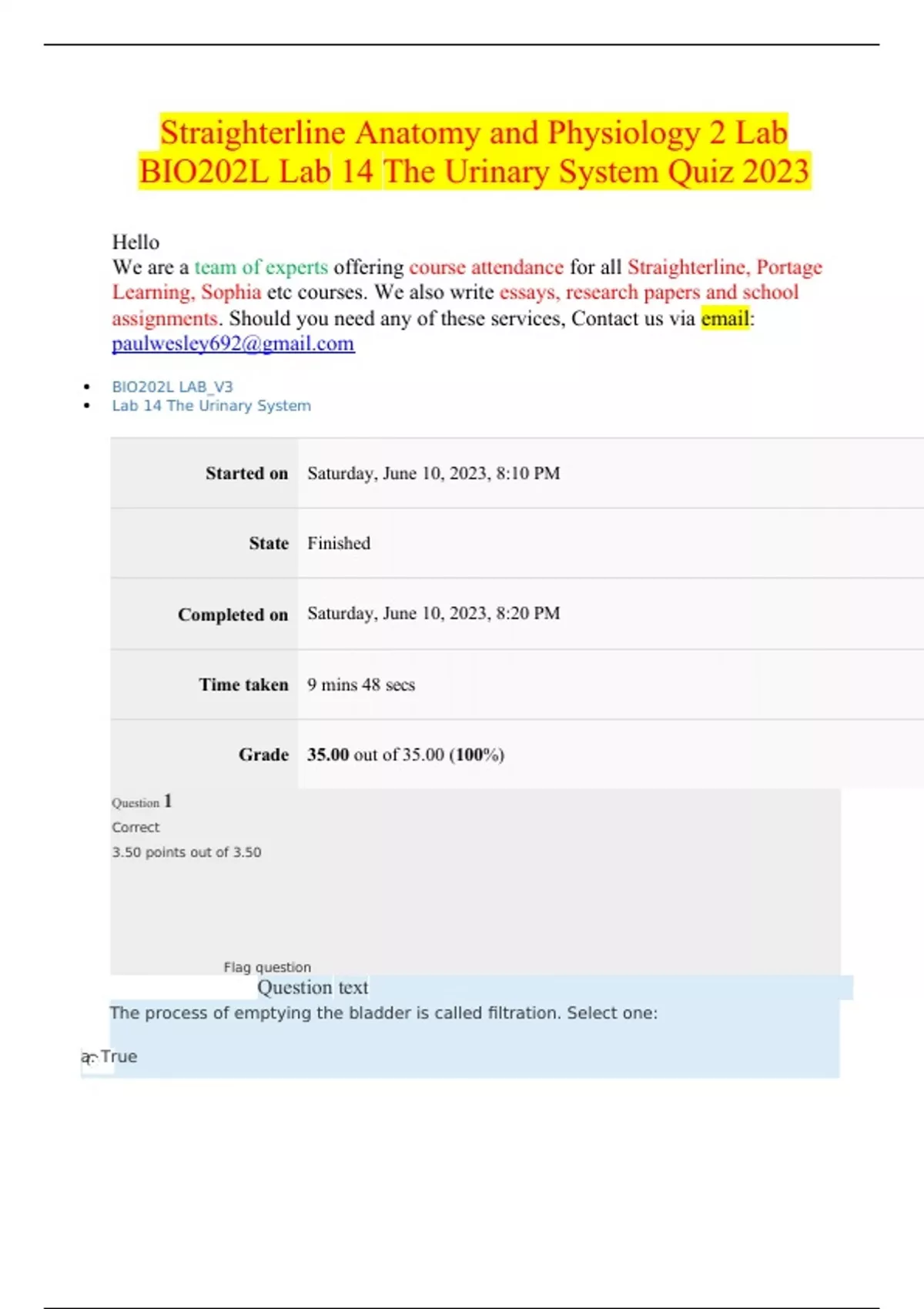 Anatomy and Physiology 2 Lab BIO202L Lab 14 The Urinary System Quiz 2023 |Straighterline