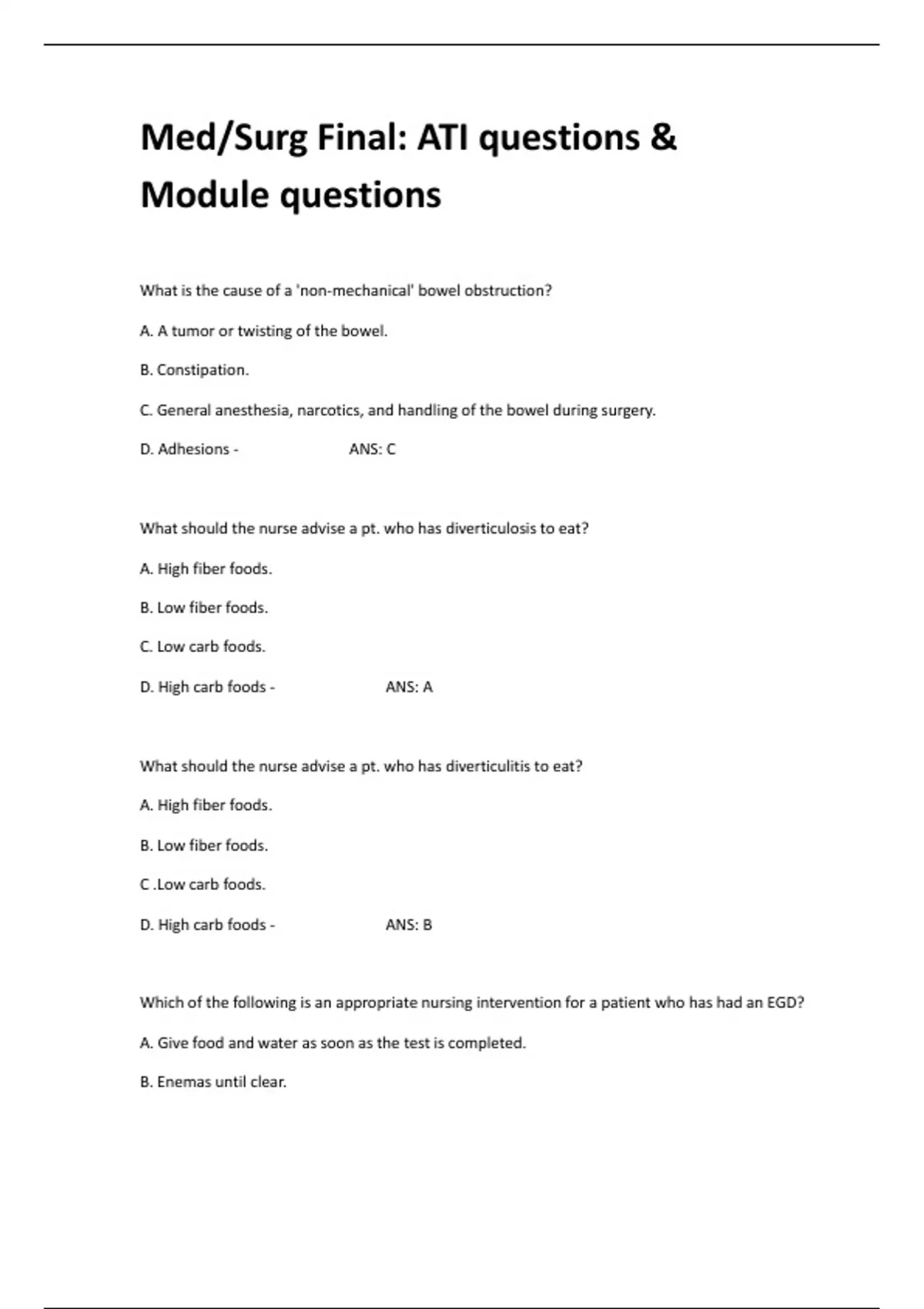 Med/Surg Final: ATI questions & Module questions What is the cause of a 'non-mechanical' bowel obstruction? A. A tumor or twisting of the bowel. B. Constipation. C. General anesthesia, narcotics, and handling of the bowel during surgery. D. Adhesions - ANS: C What should the nurse advise a pt. who has diverticulosis to eat? A. High fiber foods. B. Low fiber foods. C. Low carb foods. D. High carb foods - ANS: A What should the nurse advise a pt. who has diverticulitis to eat? A. High fiber foods. B. Low fiber foods. C .Low carb foods. D. High carb foods - ANS: B Which of the following is an appropriate nursing intervention for a patient who has had an EGD? A. Give food and water as soon as the test is completed. B. Enemas until clear. C. Monitor for hemorrhage r/t organ perforation. D. Administer a sedative. - ANS: C Which of the following is an appropriate nursing intervention for a pt. who has GERD? A. Advise pt. to remain upright after meals. B. Withhold fluids during meal time. C. Administer the appropriate immunoglobulin. D. Give the prescribed steroids with half a glass of milk. - ANS: A Which of the following is a priority for a pt. who is hemorrhaging from a perforated duodenal ulcer? A. Administer the sedative prior to the PY test. B. Monitor for shock. C. Position the pt. on his back with a pillow under his right ribs and his right hand under his head. D. Guiac his stool. - ANS: B Which of the following should the nurse advise a pt who has ulcerative colitis to call the doctor for? A. Occasional abdominal cramping B. Nine mucousy bloody stools per day. C. Signs of colon perforation and peritonitis. D. Diarrhea - ANS: C Which of the following promotes rest and healing of the bowel in a pt. who has ulcerative colitis? A.High fiber diet B. Maintaining NPO status as ordered C. Low carb diet D. Avoiding licorice and caffeine - ANS: B