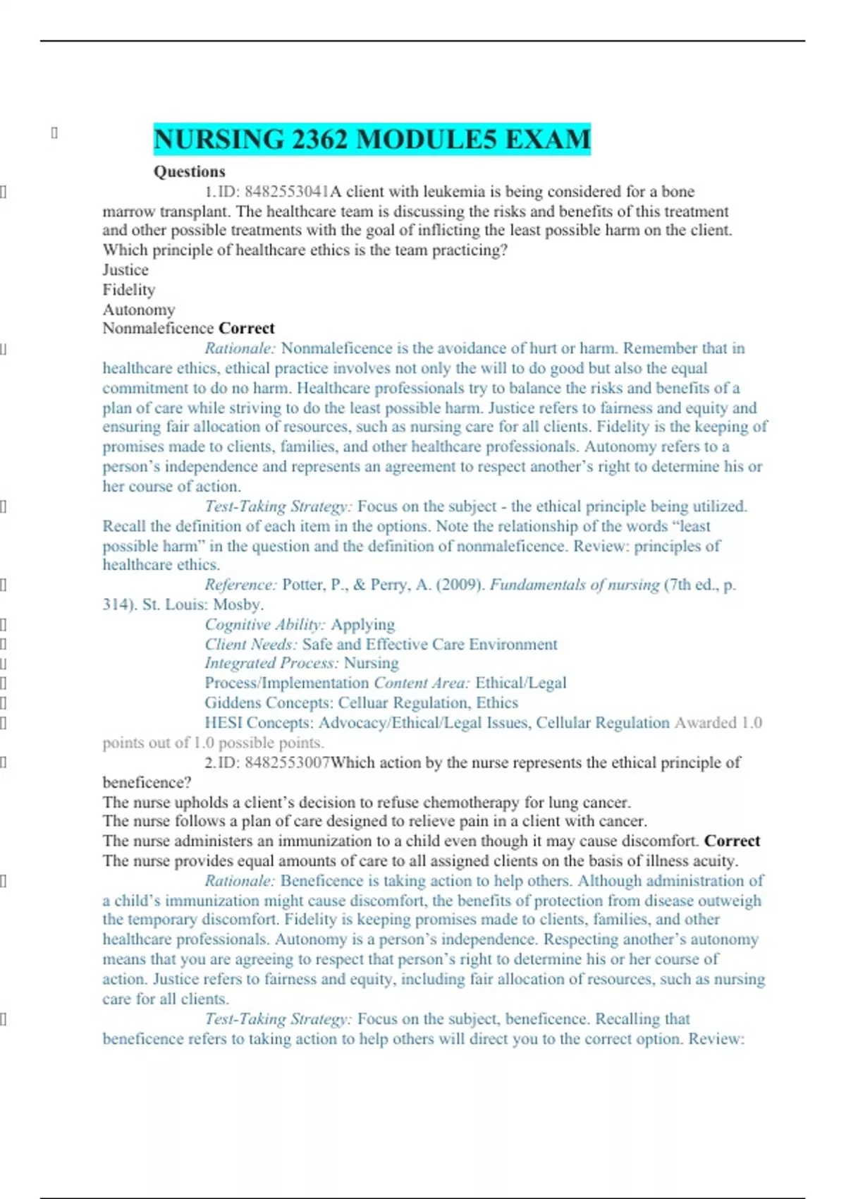 NURSING 2362 MODULE5 EXAM Questions 1. ID: A client with leukemia is being considered for a bone marrow transplant. The healthcare team is discussing the risks and benefits of this treatment and other possible treatments with the goal of inflicting the least possible harm on the client. Which principle of healthcare ethics is the team practicing? Justice Fidelity Autonomy Nonmaleficence Correct Rationale: Nonmaleficence is the avoidance of hurt or harm. Remember that in healthcare ethics, ethical practice involves not only the will to do good but also the equal commitment to do no harm. Healthcare professionals try to balance the risks and benefits of a plan of care while striving to do the least possible harm. Justice refers to fairness and equity and ensuring fair allocation of resources, such as nursing care for all clients. Fidelity is the keeping of promises made to clients, families, and other healthcare professionals. Autonomy refers to a person’s independence and represents an agreement to respect another’s right to determine his or her course of action. Test-Taking Strategy: Focus on the subject - the ethical principle being utilized. Recall the definition of each item in the options. Note the relationship of the words “least possible harm” in the question and the definition of nonmaleficence. Review: principles of healthcare ethics. Reference: Potter, P., & Perry, A. (2009). Fundamentals of nursing (7th ed., p. 314). St. Louis: Mosby. Cognitive Ability: Applying Client Needs: Safe and Effective Care Environment Integrated Process: Nursing Process/Implementation Content Area: Ethical/Legal Giddens Concepts: Celluar Regulation, Ethics HESI Concepts: Advocacy/Ethical/Legal Issues, Cellular Regulation Awarded 1.0 points out of 1.0 possible points. 2. ID: Which action by the nurse represents the ethical principle of beneficence? The nurse upholds a client’s decision to refuse chemotherapy for lung cancer. The nurse follows a plan of care designed to relieve pain in a client with cancer. The nurse administers an immunization to a child even though it may cause discomfort. Correct The nurse provides equal amounts of care to all assigned clients on the basis of illness acuity. Rationale: Beneficence is taking action to help others. Although administration of a child’s immunization might cause discomfort, the benefits of protection from disease outweigh the temporary discomfort. Fidelity is keeping promises made to clients, families, and other healthcare professionals. Autonomy is a person’s independence. Respecting another’s autonomy means that you are agreeing to respect that person’s right to determine his or her course of action. Justice refers to fairness and equity, including fair allocation of resources, such as nursing care for all clients. Test-Taking Strategy: Focus on the subject, beneficence. Recalling that beneficence refers to taking action to help others will direct you to the correct option. Review: the principles of healthcare ethics . Reference: Potter, P., & Perry, A. (2009). Fundamentals of nursing (7th ed., p. 314). St. Louis: Mosby. Cognitive Ability: Applying Client Needs: Safe and Effective Care Environment Integrated Process: Nursing Process/Implementation Content Area: Ethical/Legal Giddens Concepts: Ethics, Immunity HESI Concepts: Advocacy/Ethical/Legal Issues, Immunity Awarded 1.0 points out of 1.0 possible points. 3. ID: The nursing instructor asks a student to name an example of false imprisonment. Which situation reflects a violation of this client right? Performing a procedure without consent Telling the client that he or she may not leave the hospital Correct Threatening to give a client a medication against his or her will Observing the provision of care to the client without the client’s permission Rationale: Telling a client that he or she may not leave the hospital constitutes false imprisonment. Performing a procedure without consent is an example of battery. Threatening to give a client a medication against his or her will is assault. Invasion of privacy takes place with unreasonable intrusion into an individual’s private affairs. Observing the provision of care to a client without the client’s permission is an example of invasion of privacy. Test-Taking Strategy: Focus on the subject, an example of false imprisonment. Note the relationship of the subject and the words in the correct option. Review: the concept of false imprisonment. References: Cherry, B., & Jacob, S. (2008). Contemporary nursing issues: Trends & management (4th ed., pp. 175, 176). St. Louis: Mosby. Zerwekh, J., & Claborn, J. (2009). Nursing today: Transition and trends (6th ed., p. 424). Cognitive Ability: Evaluating Client Needs: Safe and Effective Care Environment Integrated Process: Teaching and Learning Content Area: Ethical/Legal Giddens Concepts: Health Care Law, Leadership HESI Concepts: Advocacy/Ethical/Legal Issues, Health Policy/Systems—Health Care Law Awarded 1.0 points out of 1.0 possible points. 4. ID: The nurse and an unlicensed assistive personnel (UAP)enter a client’s room to provide care and find the client lying on the floor. Which action should the nurse take first? Ask the nursing assistant to complete an incident report Check the client’s level of consciousness and vital signs Correct Ask the nursing assistant to assist in getting the client back to bed Contact the unit secretary on the intercom and ask that the client’s health care provider be called Rationale: When a client sustains a fall, the nurse must first assess the client. The nurse should check the client’s level of consciousness and vital signs and look for any bruises or injuries sustained in the fall. If the nurse determines that the client has not sustained any injuries and that it is safe to move the client, the nurse should ask the UAP to assist in getting the client into bed. The nurse should then contact the health care provider and file an incident report. 
