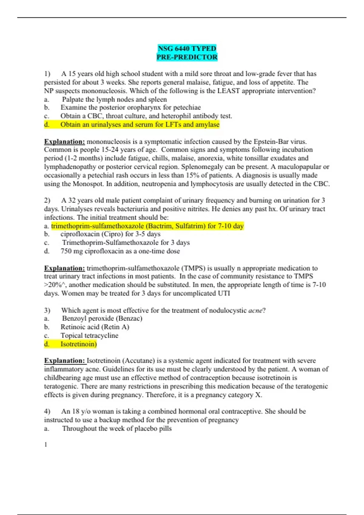 NSG 6440 TYPED PRE-PREDICTOR 1) A 15 years old high school student with a mild sore throat and low-grade fever that has persisted for about 3 weeks. She reports general malaise, fatigue, and loss of appetite. The NP suspects mononucleosis. Which of the following is the LEAST appropriate intervention? a. Palpate the lymph nodes and spleen b. Examine the posterior oropharynx for petechiae c. Obtain a CBC, throat culture, and heterophil antibody test. d. Obtain an urinalyses and serum for LFTs and amylase Explanation: mononucleosis is a symptomatic infection caused by the Epstein-Bar virus. Common is people 15-24 years of age. Common signs and symptoms following incubation period (1-2 months) include fatigue, chills, malaise, anorexia, white tonsillar exudates and lymphadenopathy or posterior cervical region. Splenomegaly can be present. A maculopapular or occasionally a petechial rash occurs in less than 15% of patients. A diagnosis is usually made using the Monospot. In addition, neutropenia and lymphocytosis are usually detected in the CBC. 2) A 32 years old male patient complaint of urinary frequency and burning on urination for 3 days. Urinalyses reveals bacteriuria and positive nitrites. He denies any past hx. Of urinary tract infections. The initial treatment should be: a. trimethoprim-sulfamethoxazole (Bactrim, Sulfatrim) for 7-10 day b. ciprofloxacin (Cipro) for 3-5 days c. Trimethoprim-Sulfamethoxazole for 3 days d. 750 mg ciprofloxacin as a one-time dose Explanation: trimethoprim-sulfamethoxazole (TMPS) is usually n appropriate medication to treat urinary tract infections in most patients. In the case of community resistance to TMPS >20%^, another medication should be substituted. In men, the appropriate length of time is 7-10 days. Women may be treated for 3 days for uncomplicated UTI 3) Which agent is most effective for the treatment of nodulocystic acne? a. Benzoyl peroxide (Benzac) b. Retinoic acid (Retin A) c. Topical tetracycline d. Isotretinoin) Explanation: Isotretinoin (Accutane) is a systemic agent indicated for treatment with severe inflammatory acne. Guidelines for its use must be clearly understood by the patient. A woman of childbearing age must use an effective method of contraception because isotretinoin is teratogenic. There are many restrictions in prescribing this medication because of the teratogenic effects is given during pregnancy. Therefore, it is a pregnancy category X. 4) An 18 y/o woman is taking a combined hormonal oral contraceptive. She should be instructed to use a backup method for the prevention of pregnancy a. Throughout the week of placebo pills b. If prescribed topiramate (Topamax) for the treatment of migraines. c. If prescribed amoxicillin/clavulanate (Augmentin) for a sinus infection d. if she forgets to take a single dose of the contraceptive Explanation: Anticonvulsant including phenytoin (Dilantin), carbamazepine (Tegretol), primidone (Mysoline), topiramate (Topamax) and oxcarbazepine (Trileptal) reduce the effectiveness of contraceptives. Depo-medroxyprogesterone acetate injections or levonorgestrel- releasing intrauterine devices would be a better method of contraceptive for patients taking anticonvulsants. Most commonly used antibiotics have not been proven to reduce the effectiveness of contraceptives. Rifampin is an exception, and additional …. Be used by women taking this drug and using oral contraceptives, transdermal, or vaginal ring preparations. Additional backup contraception should be used if taking antifungal agents. No additional protection is needed thought the week of placebo pills. Missing one single dose of contraceptive does not require additional protection, missing more than one doses does. 5) A 44 years old female patient has diabetes. Her total cholesterol (TC) is 250 mg/dl (6.5 mmol/L), LDL= 190 mg/dL (4.94 mmol/L), HDL= 25 mg/dL (65 mmol/L), and triglycerides= 344 mg/dL (8.94 mmol/L). What agent have the greatest effect on improving her lipid profile and reducing morbidity and mortality associates with dyslipidemia? a. Niacin (Niaspan) b. Atorvastatin c. Omega 3 fatty acids d. Fenofibrates Explanation: First and foremost, it is essential to educate individuals on a heart-healthy lifestyle. LDL-C is one of the major culprits in the development of atherosclerotic heart disease. The target level of LDL-C is between 50 to 70mg/dl to prevent plaque formation in the blood vessels. Guidelines strongly recommend statin therapy because they primarily lower LDL-C levels, but they also have the secondary effects of lowering triglyceride and increasing HDL-C levels. 6) A 30 years old female comes into a clinic with classic signs and symptoms of appendicitis. The NP fails to refer the patient to a surgeon. The appendix ruptures and the woman die. This is an example of a. Failure of diligence b. Professional liability c. Negligence d. Malpractice Explanation: malpractice, a negligence tort, occurs when a health care professional’s actions fall bellow the appropriate standard of care and hurts the patient. In this case the patient came with sings and symptoms indicating appendicitis and the NP failed to refer the patient.. 7) A NP has recently been hired to work in a fast track facility. The NP employer asked if she has “a problem prescribing medications for emergency contraception.” The NP replies affirmatively. This is: a. Grounds for dismissal b. An ethical dilemma for the NP c. Illegal according to the standards of nursing d. Patient abandonment. Explanation: in this instance, the NP has a difference of opinion with her employer based on her religious or moral belief about providing emergency contraception. This situation is an example of an ethical dilemma. Failure to participate in the provision of care to the patient based on the NP’s beliefs is neither against the law nor a violation of the standards of practice 8) A patient presents with pruritic lesions on both knees. There are visible silver scales. How Shou
