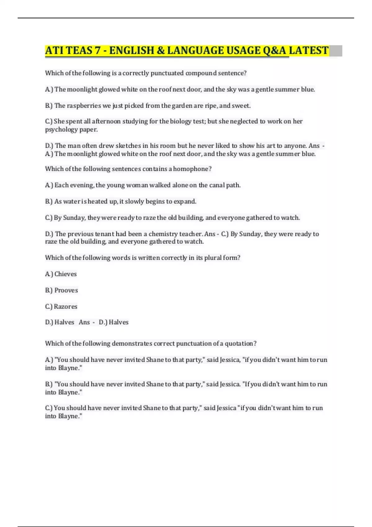 ATI TEAS 7 - ENGLISH & LANGUAGE USAGE Q&A LATEST Which of the following is a correctly punctuated compound sentence? A.) The moonlight glowed white on the roof next door, and the sky was a gentle summer blue. B.) The raspberries we just picked from the garden are ripe, and sweet. C.) She spent all afternoon studying for the biology test; but she neglected to work on her psychology paper. D.) The man often drew sketches in his room but he never liked to show his art to anyone. Ans - A.) The moonlight glowed white on the roof next door, and the sky was a gentle summer blue. Which of the following sentences contains a homophone? A.) Each evening, the young woman walked alone on the canal path. B.) As water is heated up, it slowly begins to expand. C.) By Sunday, they were ready to raze the old building, and everyone gathered to watch. D.) The previous tenant had been a chemistry teacher. Ans - C.) By Sunday, they were ready to raze the old building, and everyone gathered to watch. Which of the following words is written correctly in its plural form? A.) Chieves B.) Prooves C.) Razores D.) Halves Ans - D.) Halves Which of the following demonstrates correct punctuation of a quotation? A.)"You should have never invited Shane to that party," said Jessica,"if you didn't want him to run into Blayne." B.)"You should have never invited Shane to that party," said Jessica."If you didn't want him to run into Blayne." C.) You should have never invited Shane to that party," said Jessica "if you didn't want him to run into Blayne." D.)"You should have never invited Shane to that party," said Jessica,"If you didn't want him to run into Blayne." Ans - A.) "You should have never invited Shane to that party," said Jessica, "if you didn't want him to run into Blayne." Which of the following punctuation marks correctly completes the sentence below? I need an assistant who can do the following input data, edit reports, and maintain the website. A.) ; B.) : C.) , D.) . Ans - B.) : Which of the following punctuation marks is used incorrectly in the sentence below? She put down her glasses, and her book; the train was starting to enter the long, dark tunnel. A.) The semicolon after "book" B.) The comma after "long" C.) The comma after "glasses" D.) The period at the end of the sentence Ans - C.) The comma after "glasses" Please don't take what I said so personally. Which of the following parts of speech is "personally" as used in the sentence above? A.) Article B.) Adjective C.) Verb D.) Adverb Ans - D.) Adverb He had to fill out a health history before seeing the doctor. A.) questionnaire B.) questionaire C.) questionnare D.) questionairre Ans - A.) questionnaire Which of the following sentences contains an indirect object? A.) Melissa walked to the grocery store for milk. B.) Dante skimmed the magazine while waiting in the lobby. C.) Jorge assigned the class some math problems. D.) Sara went to the movie with Amal. Ans - C.) Jorge assigned the class some math problems. The plump old white cat basked in the warm sunlight. Which of the following options correctly punctuates the sentence above? A.) The plump, old, white cat basked in the warm sunlight B.) The plump, old, white, cat basked in the warm sunlight C.) The plump, old white cat basked in the warm sunlight. D.) The plump old white cat, basked in the warm sunlight. Ans - A.) The plump, old, white cat basked in the warm sunlight. Which of the following words is spelled correctly? A.) Miniscool B.) Minature C.) Maintainance D.) Millennium Ans - D.) Millennium Which of the following options contains a possessive pronoun? A.) If the patient chooses to leave, let them know the right to do so is theirs. B.) When we support patients in these ways, the hospital's mission is accomplished. C.) Take personal items to the front desk once you are finished. D.) This hospital has some problems, no doubt. Ans - A.) If the patient chooses to leave, let them know the right to do so is theirs. Which of the following sentences from a paragraph about gingivitis is the topic sentence? A.) Gingivitis can be reversed by daily brushing, flossing, and regular dental cleanings. B.) Gingivitis is a mild form of gum disease, in which bacteria causes inflammation of the gums