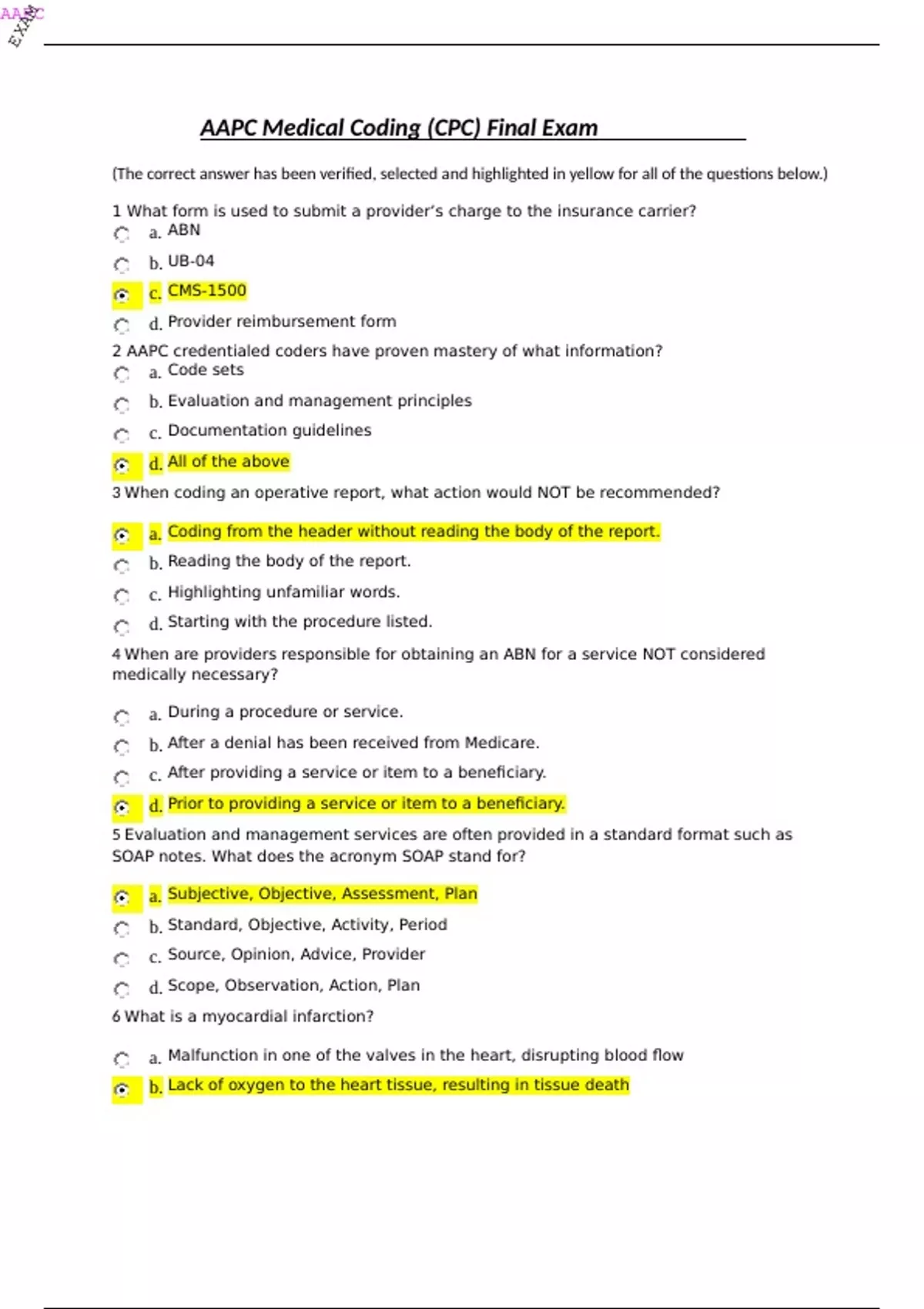 (The correct answer has been verified, selected and highlighted in yellow for all of the questions below.) 1 What form is used to submit a provider’s charge to the insurance carrier? a. ABN b. UB-04 c. CMS-1500 d. Provider reimbursement form 2 AAPC credentialed coders have proven mastery of what information? a. Code sets b. Evaluation and management principles c. Documentation guidelines d. All of the above 3 When coding an operative report, what action would NOT be recommended? a. Coding from the header without reading the body of the report. b. Reading the body of the report. c. Highlighting unfamiliar words. d. Starting with the procedure listed. 4 When are providers responsible for obtaining an ABN for a service NOT considered medically necessary? a. During a procedure or service. b. After a denial has been received from Medicare. c. After providing a service or item to a beneficiary. d. Prior to providing a service or item to a beneficiary. 5 Evaluation and management services are often provided in a standard format such as SOAP notes. What does the acronym SOAP stand for? a. Subjective, Objective, Assessment, Plan b. Standard, Objective, Activity, Period c. Source, Opinion, Advice, Provider d. Scope, Observation, Action, Plan 6 What is a myocardial infarction? a. Malfunction in one of the valves in the heart, disrupting blood flow b. Lack of oxygen to the heart tissue, resulting in tissue death c. Abnormal heart beats causing pain, nausea and discomfort d. Overgrowth of muscle tissue, affecting the heart’s ability to pump 7 Which of the following is true about the function of the cochlea? a. It helps with balance only b. It helps with balance and sound transmission c. Its function is to excrete cerumen (wax) to help keep the ear clean d. It transmits sound only 8 Which of the following best describes psoriasis? a. An inflammatory condition characterized by redness pustular and vesicular lesions, crusts, and scales. b. An allergic reaction characterized by wheals and generally accompanied by pruritus. c. A chronic condition characterized by red, dry, elevated lesions, covered by silvery scales. d. A contagious infection of skin generally caused by staphylococcus bacterium. 9 A thin membrane lining the chambers of the heart and valves is called the: a. Epicardium b. Endocardium c. Pericardium d. Myocardium 10 The dome-shaped muscle under the lungs flattening during inspiration is the: a. Diaphragm b. Pleura c. Mediastinum d. Bronchus 11 When a patient has a condition that is both acute and chronic and there are separate entries for both, how is it reported? a. Code only the chronic code b. Code only the acute code c. Code both sequencing the acute first d. Code both seque