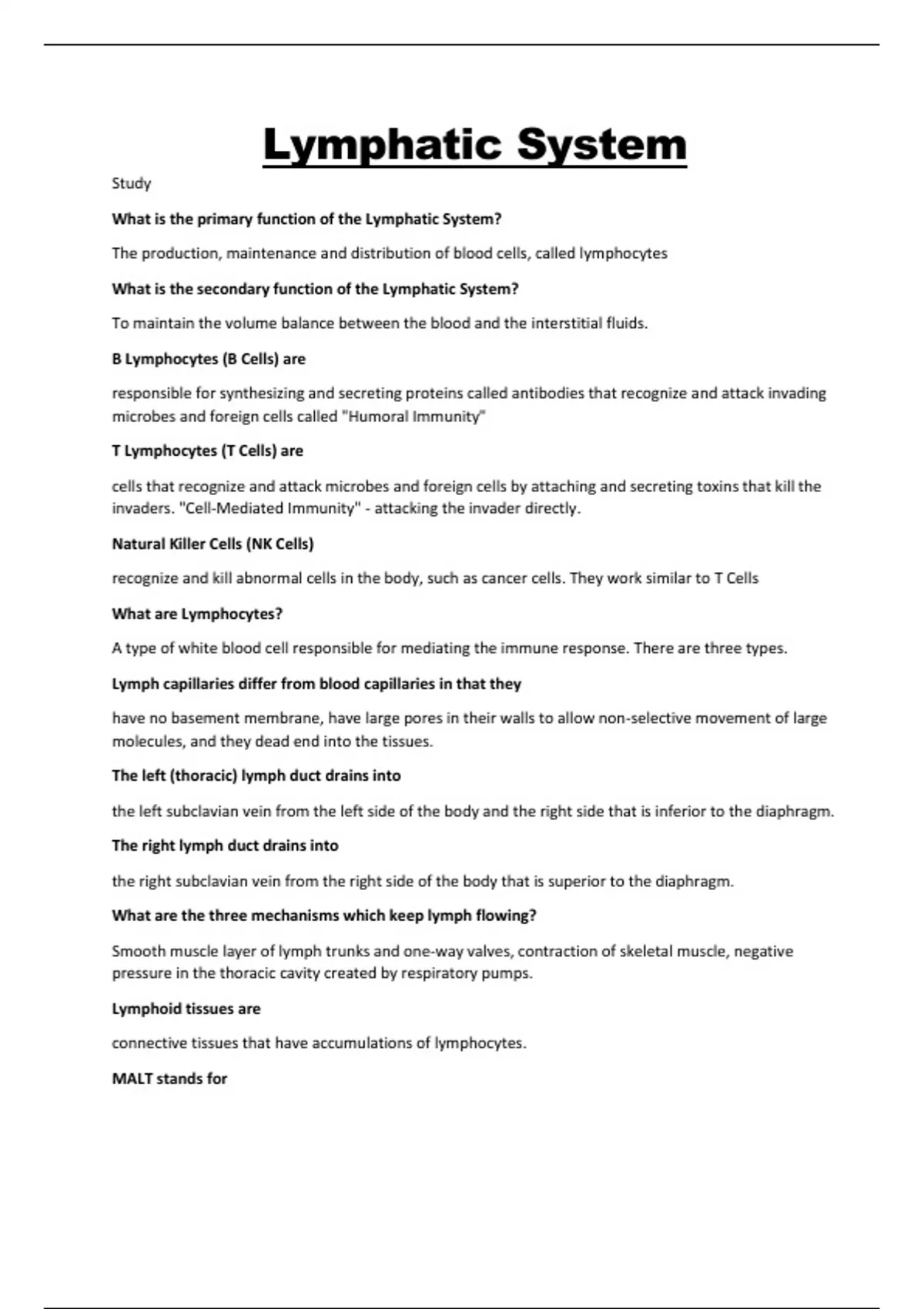 What is the primary function of the Lymphatic System? The production, maintenance and distribution of blood cells, called lymphocytes What is the secondary function of the Lymphatic System? To maintain the volume balance between the blood and the interstitial fluids. B Lymphocytes (B Cells) are responsible for synthesizing and secreting proteins called antibodies that recognize and attack invading microbes and foreign cells called "Humoral Immunity" T Lymphocytes (T Cells) are cells that recognize and attack microbes and foreign cells by attaching and secreting toxins that kill the invaders. "Cell-Mediated Immunity" - attacking the invader directly. Natural Killer Cells (NK Cells) recognize and kill abnormal cells in the body, such as cancer cells. They work similar to T Cells What are Lymphocytes? A type of white blood cell responsible for mediating the immune response. There are three types. Lymph capillaries differ from blood capillaries in that they have no basement membrane, have large pores in their walls to allow non-selective movement of large molecules, and they dead end into the tissues. The left (thoracic) lymph duct drains into the left subclavian vein from the left side of the body and the right side that is inferior to the diaphragm. The right lymph duct drains into the right subclavian vein from the right side of the body that is superior to the diaphragm. What are the three mechanisms which keep lymph flowing? Smooth muscle layer of lymph trunks and one-way valves, contraction of skeletal muscle, negative pressure in the thoracic cavity created by respiratory pumps. Lymphoid tissues are connective tissues that have accumulations of lymphocytes. MALT stands fo