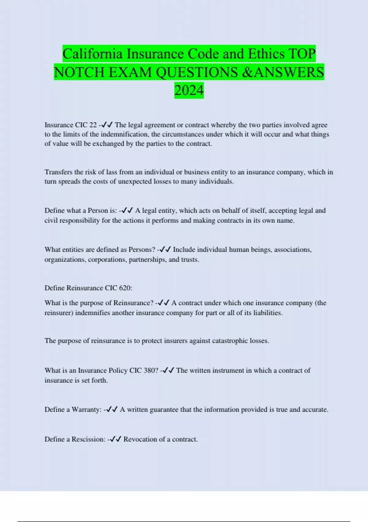 California Insurance Code and Ethics TOP NOTCH EXAM QUESTIONS &ANSWERS 2024