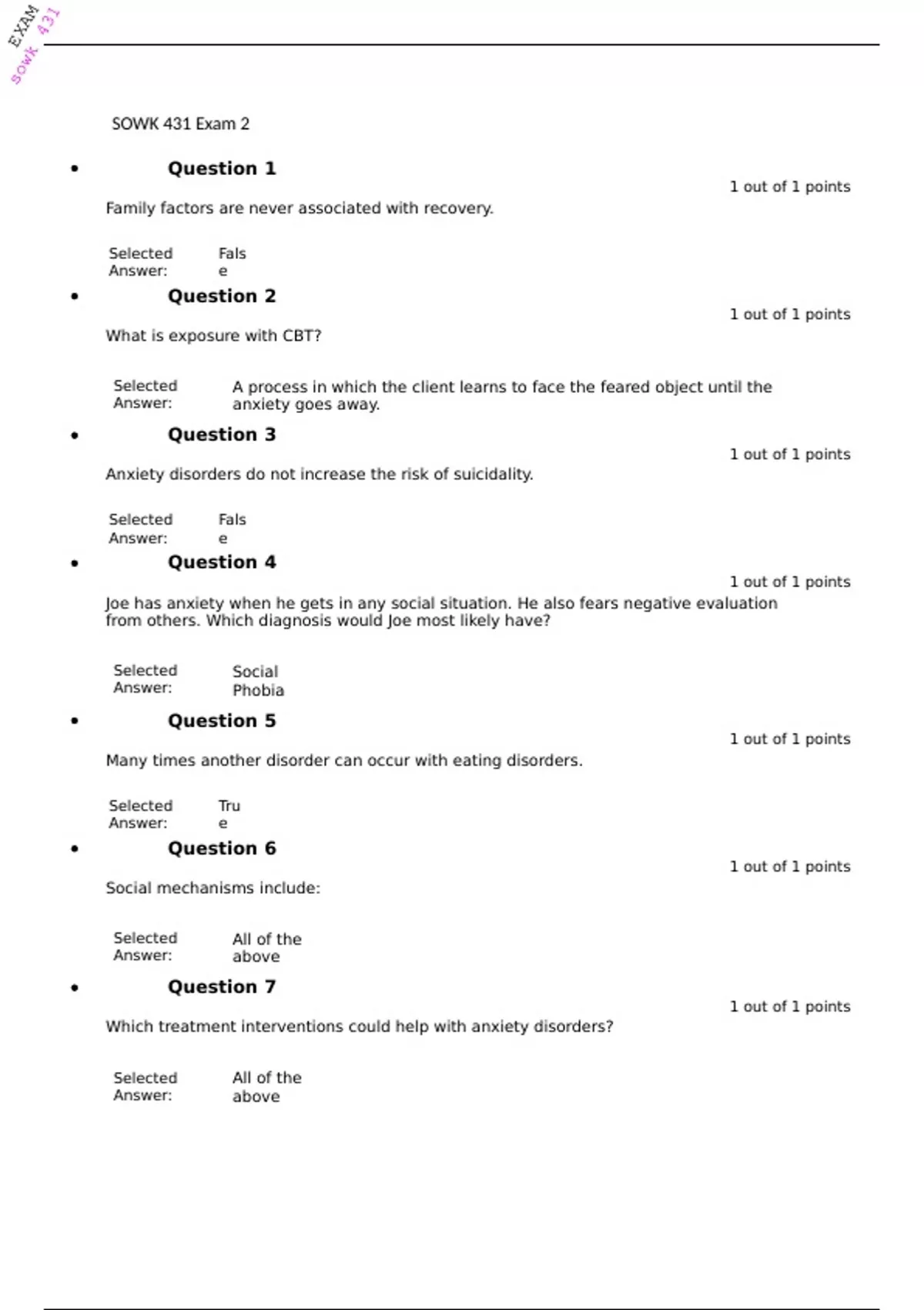 SOWK 431 Exam 2 Question 1 1 out of 1 points Family factors are never associated with recovery. Selected Answer: Fals e Question 2 1 out of 1 points What is exposure with CBT? Selected Answer: A process in which the client learns to face the feared object until the anxiety goes away. Question 3 1 out of 1 points Anxiety disorders do not increase the risk of suicidality. Selected Answer: Fals e Question 4 1 out of 1 points Joe has anxiety when he gets in any social situation. He also fears negative evaluation from others. Which diagnosis would Joe most likely have? Selected Answer: Social Phobia