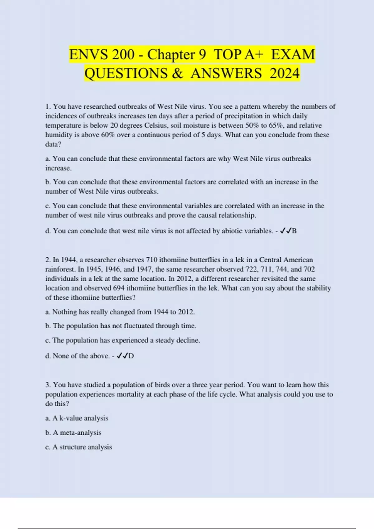 1. You have researched outbreaks of West Nile virus. You see a pattern whereby the numbers of incidences of outbreaks increases ten days after a period of precipitation in which daily temperature is below 20 degrees Celsius, soil moisture is between 50% to 65%, and relative humidity is above 60% over a continuous period of 5 days. What can you conclude from these data? a. You can conclude that these environmental factors are why West Nile virus outbreaks increase. b. You can conclude that these environmental factors are correlated with an increase in the number of West Nile virus outbreaks. c. You can conclude that these environmental variables are correlated with an increase in the number of west nile virus outbreaks and prove the causal relationship. d. You can conclude that west nile virus is not affected by abiotic variables. - B 2. In 1944, a researcher observes 710 ithomiine butterflies in a lek in a Central American rainforest. In 1945, 1946, and 1947, the same researcher observed 722, 711, 744, and 702 individuals in a lek at the same location. In 2012, a different researcher revisited the same location and observed 694 ithomiine butterflies in the lek. What can you say about the stability of these ithomiine butterflies? a. Nothing has really changed from 1944 to 2012. b. The population has not fluctuated through time. c. The population has experienced a steady decline. d. None of the above. - D 3. You have studied a population of birds over a three year period. You want to learn how this population experiences mortality at each phase of the life cycle. What analysis could you use to do this? a. A k-value analysis b. A meta-analysis c. A structure analysis