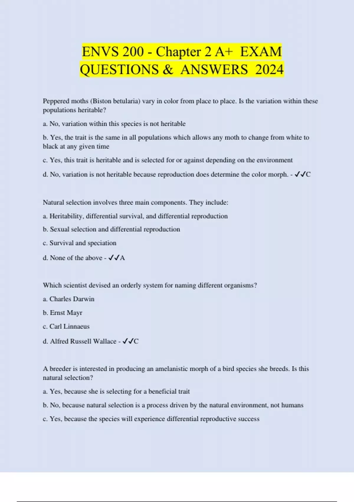 Peppered moths (Biston betularia) vary in color from place to place. Is the variation within these populations heritable? a. No, variation within this species is not heritable b. Yes, the trait is the same in all populations which allows any moth to change from white to black at any given time c. Yes, this trait is heritable and is selected for or against depending on the environment d. No, variation is not heritable because reproduction does determine the color morph. - C Natural selection involves three main components. They include: a. Heritability, differential survival, and differential reproduction b. Sexual selection and differential reproduction c. Survival and speciation d. None of the above - A Which scientist devised an orderly system for naming different organisms? a. Charles Darwin b. Ernst Mayr c. Carl Linnaeus d. Alfred Russell Wallace - C