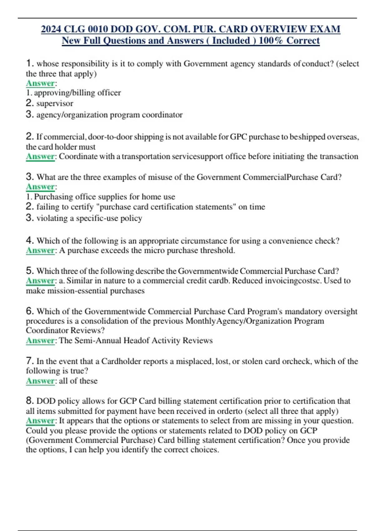 2024 CLG 0010 DOD GOV. COM. PUR. CARD OVERVIEW EXAM New Full Questions and Answers ( Included ) 100% Correct 1. whose responsibility is it to comply with Government agency standards of conduct? (select the three that apply) Answer: 1. approving/billing officer 2. supervisor 3. agency/organization program coordinator 2. If commercial, door-to-doorshipping is not available for GPC purchase to beshipped overseas, the card holder must Answer: Coordinate with a transportation servicesupport office before initiating the transaction 3. What are the three examples of misuse of the Government CommercialPurchase Card? Answer: 1. Purchasing office supplies for home use 2. failing to certify "purchase card certification statements" on time 3. violating a specific-use policy 4. Which of the following is an appropriate circumstance for using a convenience check? Answer: A purchase exceeds the micro purchase threshold. 5. Which three ofthe following describe the GovernmentwideCommercial Purchase Card? Answer: a. Similar in nature to a commercial credit cardb. Reduced invoicingcostsc. Used to make mission-essential purchases 6. Which of the Governmentwide Commercial Purchase Card Program's mandatory oversight procedures is a consolidation of the previous MonthlyAgency/Organization Program Coordinator Reviews? Answer: The Semi-Annual Headof Activity Reviews 7. In the event that a Cardholder reports a misplaced, lost, or stolen card orcheck, which of the following is true? Answer: all of these 8. DOD policy allows for GCP Card billing statement certification prior to certification that all items submitted for payment have been received in orderto (select all three that apply) Answer: It appears that the options or statements to select from are missing in your question. Could you please provide the options or statements related to DOD policy on GCP (Government Commercial Purchase) Card billing statement certification? Once you provide the options, I can help you identify the correct choices.