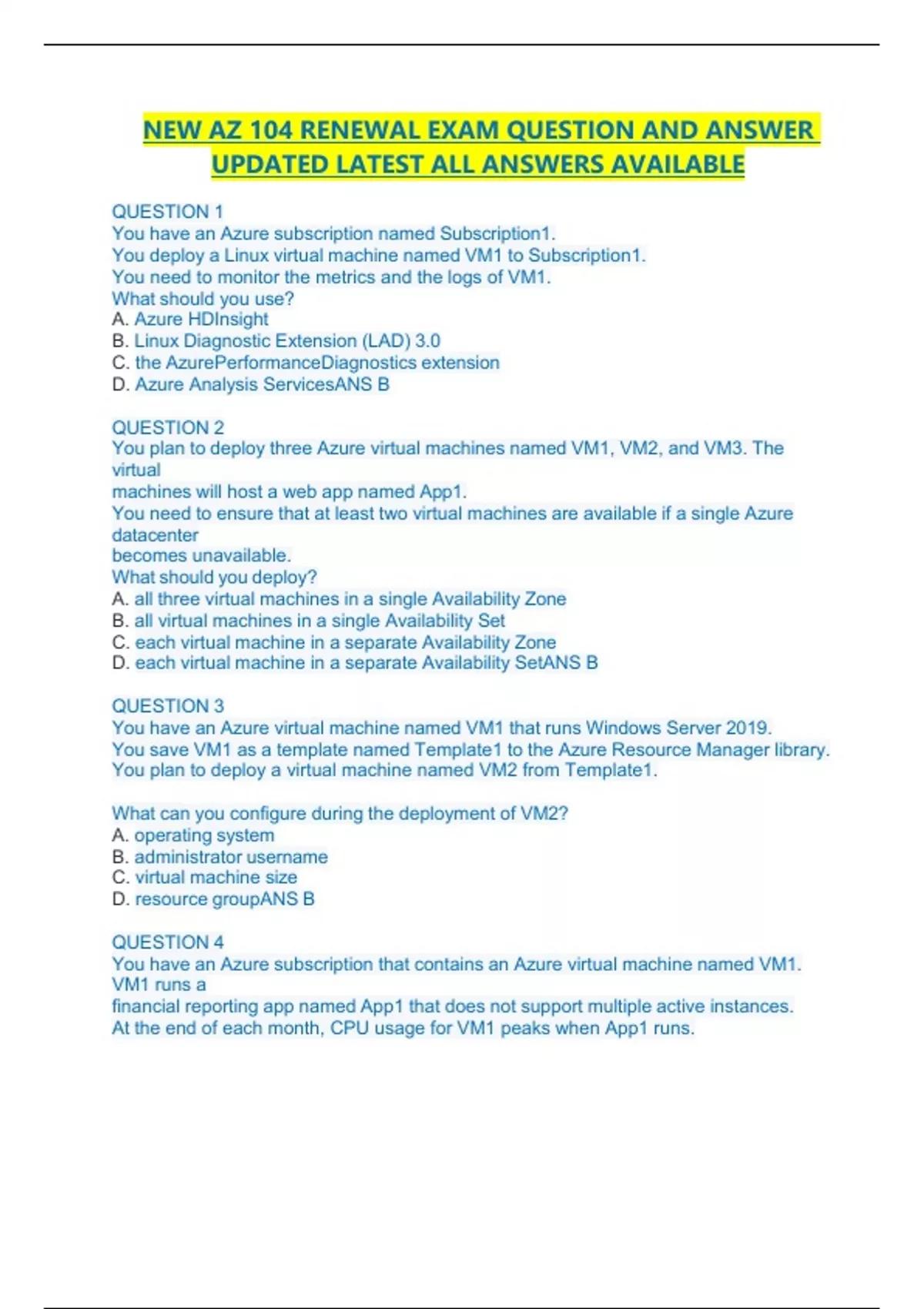 NEW AZ 104 RENEWAL EXAM QUESTION AND ANSWER UPDATED LATEST ALL ANSWERS AVAILABLE QUESTION 1 You have an Azure subscription named Subscription1. You deploy a Linux virtual machine named VM1 to Subscription1. You need to monitor the metrics and the logs of VM1. What should you use? A.Azure HDInsight B.Linux Diagnostic Extension (LAD) 3.0 C.the AzurePerformanceDiagnostics extension D.Azure Analysis ServicesANS B QUESTION 2 You plan to deploy three Azure virtual machines named VM1, VM2, and VM3. The virtual machines will host a web app named App1. You need to ensure that at least two virtual machines are available if a single Azure datacenter becomes unavailable. What should you deploy? A.all three virtual machines in a single Availability Zone B.all virtual machines in a single Availability Set C.each virtual machine in a separate Availability Zone D.each virtual machine in a separate Availability SetANS B QUESTION 3 You have an Azure virtual machine named VM1 that runs Windows Server 2019. You save VM1 as a template named Template1 to the Azure Resource Manager library. You plan to deploy a virtual machine named VM2 from Template1. What can you configure during the deployment of VM2? A.operating system B.administrator username C.virtual machine size D.resource groupANS B QUESTION 4 You have an Azure subscription that contains an Azure virtual machine named VM1. VM1 runs a financial reporting app named App1 that does not support multiple active instances. At the end of each month, CPU usage for VM1 peaks when App1 runs. You need to create a scheduled runbook to increase the processor performance of VM1 at the end of each month. What task should you include in the runbook? A.Add the Azure Performance Diagnostics agent to VM1. B.Modify the VM size property of VM1. C.Add VM1 to a scale set. D.Increase the vCPU quota for the subscription. E.Add a Desired State Configuration (DSC) extension to VM1.ANS E QUESTION 5 Note: This question is part of a series of questions You have an Azure subscription that contains 10 virtual networks. The virtual networks are hosted in separate resource groups. Another administrator plans to create several network security groups (NSGs) in the subscription. You need to ensure that when an NSG is created, it automatically blocks TCP port 8080 between the virtual networks. Solution: You configure a custom policy definition, and then you assign the policy to the subscription. Does this meet the goal? A.Yes B.NoANS A