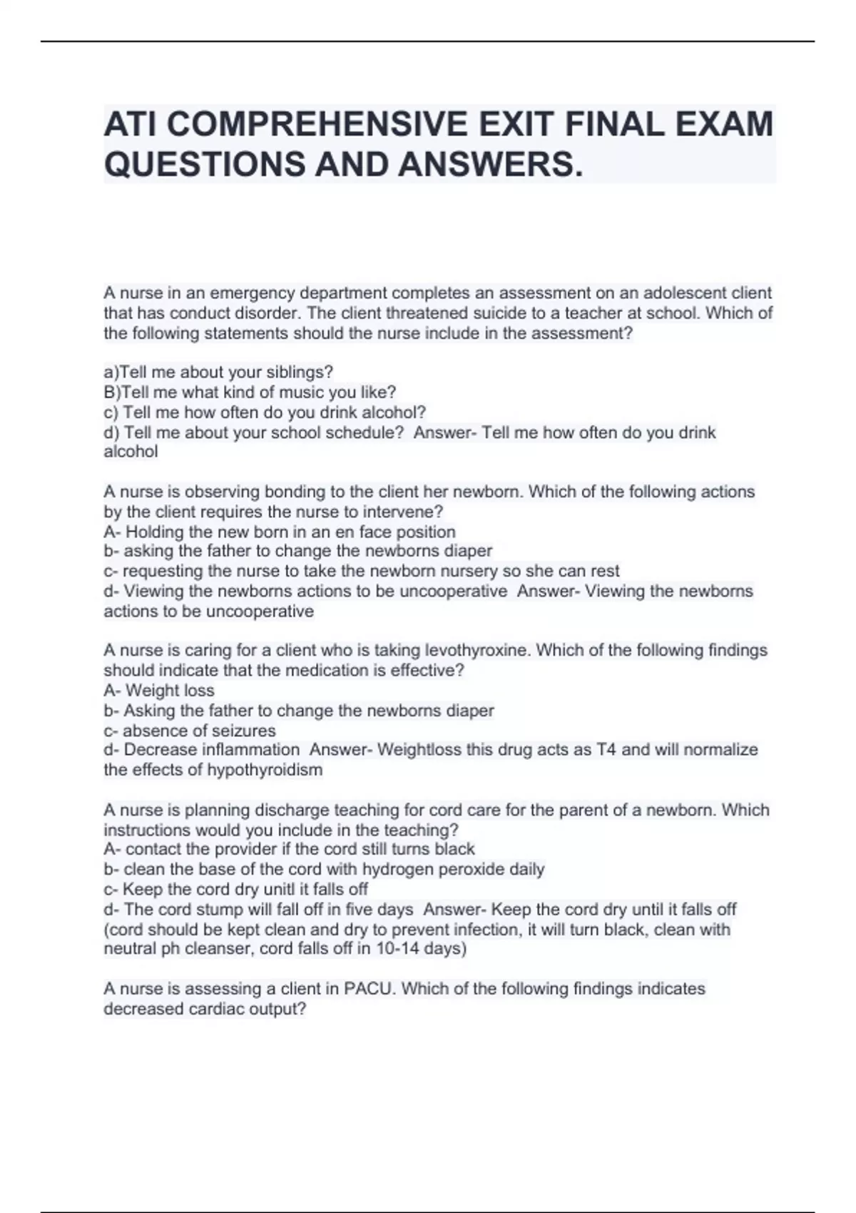ATI COMPREHENSIVE EXIT FINAL EXAM QUESTIONS AND ANSWERS