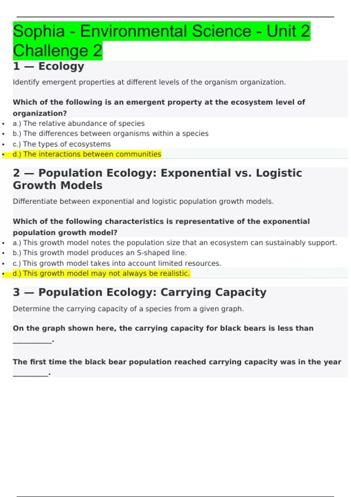 1 — Ecology Identify emergent properties at different levels of the organism organization. Which of the following is an emergent property at the ecosystem level of organization? • a.) The relative abundance of species • b.) The differences between organisms within a species • c.) The types of ecosystems • d.) The interactions between communities 2 — Population Ecology: Exponential vs. Logistic Growth Models Differentiate between exponential and logistic population growth models. Which of the following characteristics is representative of the exponential population growth model? • a.) This growth model notes the population size that an ecosystem can sustainably support. • b.) This growth model produces an S-shaped line. • c.) This growth model takes into account limited resources. • d.) This growth model may not always be realistic. 3 — Population Ecology: Carrying Capacity Determine the carrying capacity of a species from a given graph. On the graph shown here, the carrying capacity for black bears is less than ___________. The first time the black bear population reached carrying capacity was in the year __________.