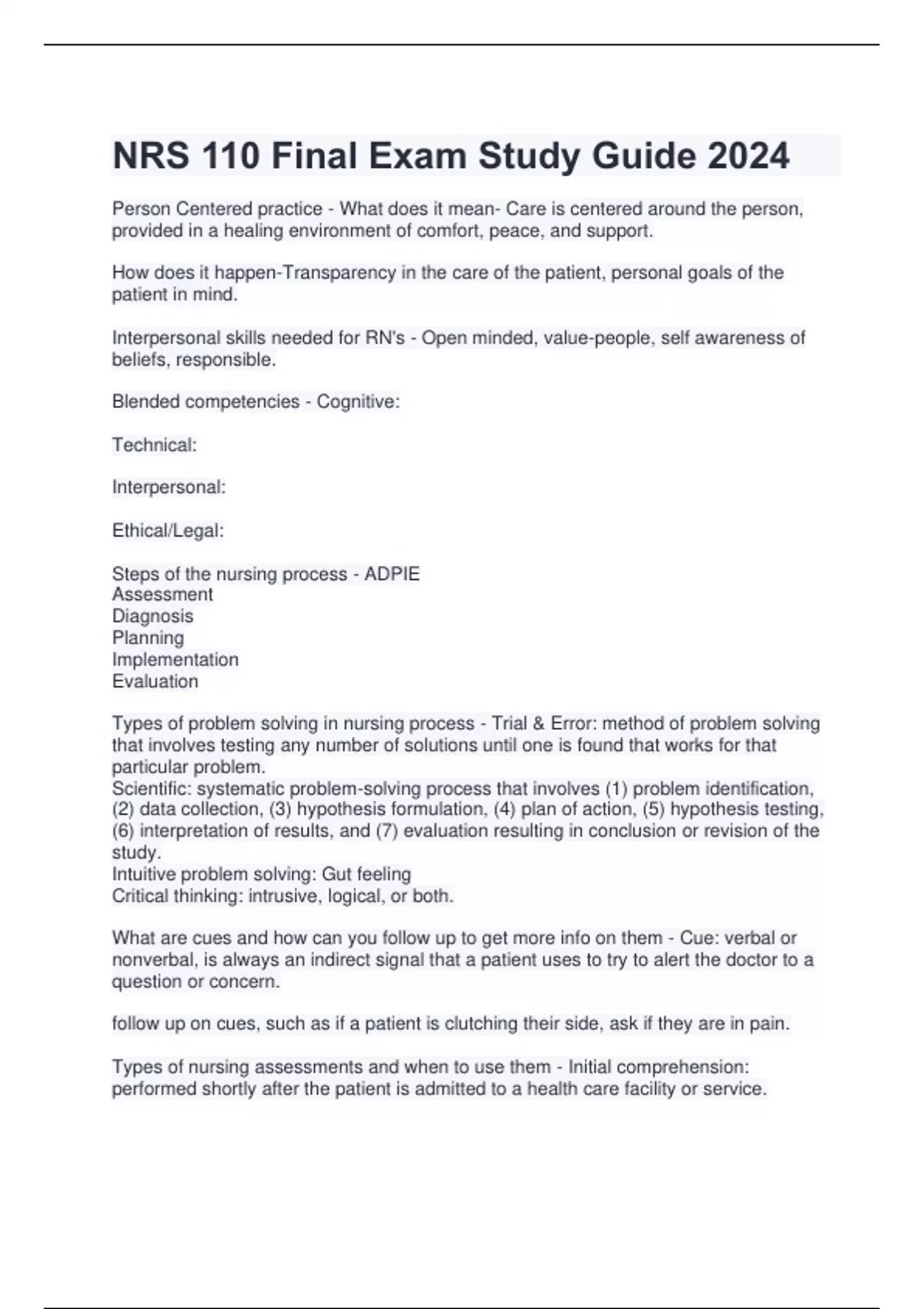 Person Centered practice - What does it mean- Care is centered around the person, provided in a healing environment of comfort, peace, and support. How does it happen-Transparency in the care of the patient, personal goals of the patient in mind. Interpersonal skills needed for RN's - Open minded, value-people, self awareness of beliefs, responsible. Blended competencies - Cognitive: Technical: Interpersonal: Ethical/Legal: Steps of the nursing process - ADPIE Assessment Diagnosis Planning Implementation Evaluation Types of problem solving in nursing process - Trial & Error: method of problem solving that involves testing any number of solutions until one is found that works for that particular problem. Scientific: systematic problem-solving process that involves (1) problem identification, (2) data collection, (3) hypothesis formulation, (4) plan of action, (5) hypothesis testing, (6) interpretation of results, and (7) evaluation resulting in conclusion or revision of the study. Intuitive problem solving: Gut feeling Critical thinking: intrusive, logical, or both. What are cues and how can you follow up to get more info on them - Cue: verbal or nonverbal, is always an indirect signal that a patient uses to try to alert the doctor to a question or concern. follow up on cues, such as if a patient is clutching their side, ask if they are in pain. Types of nursing assessments and when to use them - Initial comprehension: performed shortly after the patient is admitted to a health care facility or service.