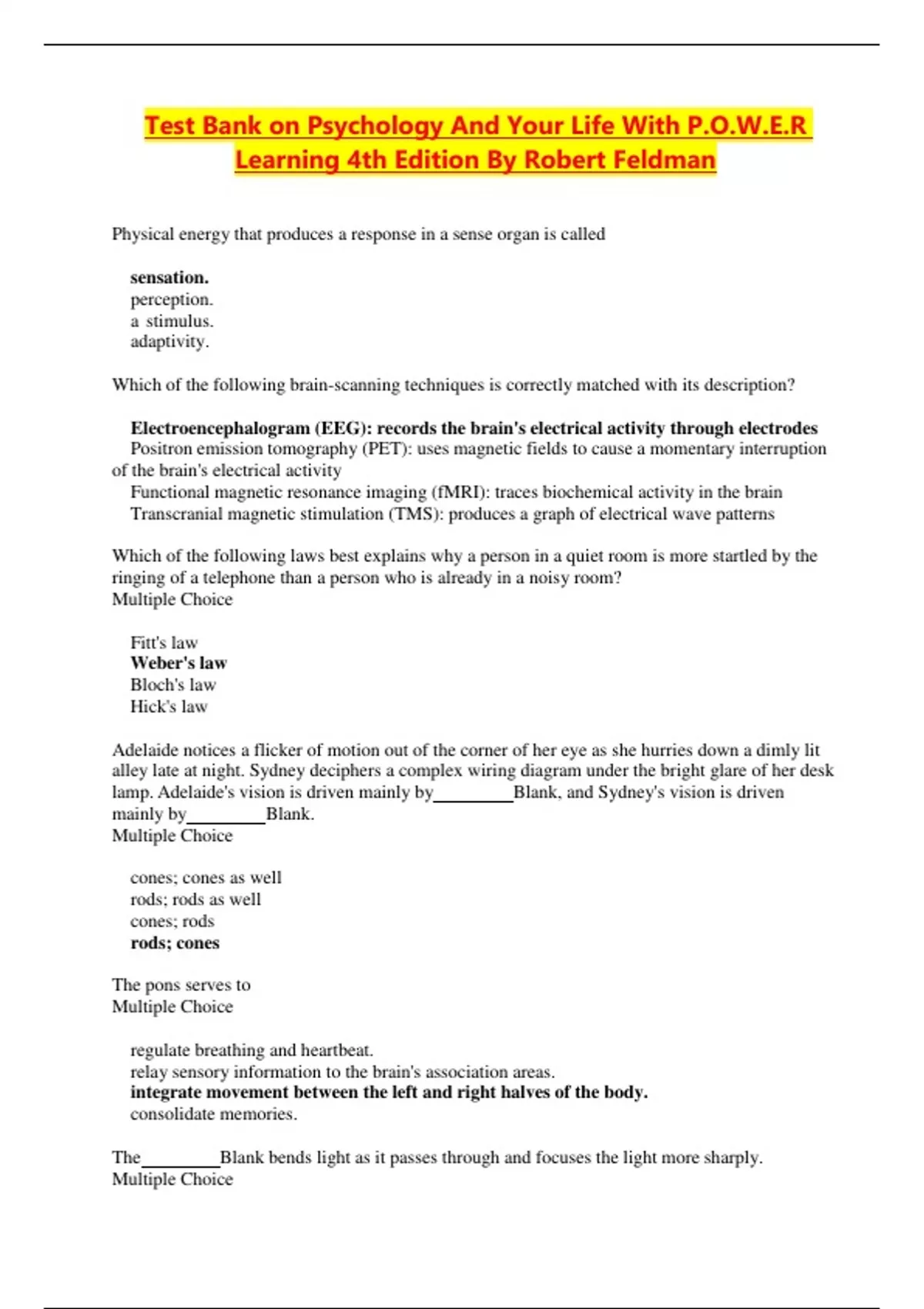 Test Bank on Psychology And Your Life With P.O.W.E.R Learning 4th Edition By Robert Feldman Physical energy that produces a response in a sense organ is called sensation. perception. a stimulus. adaptivity. Which of the following brain-scanning techniques is correctly matched with its description? Electroencephalogram (EEG): records the brain's electrical activity through electrodes Positron emission tomography (PET): uses magnetic fields to cause a momentary interruption of the brain's electrical activity Functional magnetic resonance imaging (fMRI): traces biochemical activity in the brain Transcranial magnetic stimulation (TMS): produces a graph of electrical wave patterns Which of the following laws best explains why a person in a quiet room is more startled by the ringing of a telephone than a person who is already in a noisy room? Multiple Choice Fitt's law Weber's law Bloch's law Hick's law Adelaide notices a flicker of motion out of the corner of her eye as she hurries down a dimly lit alley late at night. Sydney deciphers a complex wiring diagram under the bright glare of her desk lamp. Adelaide's vision is driven mainly by Blank, and Sydney's vision is driven mainly by Blank. Multiple Choice cones; cones as well rods; rods as well cones; rods rods; cones The pons serves to Multiple Choice regulate breathing and heartbeat. relay sensory information to the brain's association areas. integrate movement between the left and right halves of the body. consolidate memories. The Blank bends light as it passes through and focuses the light more sharply. Multiple Choice cornea pupil iris lens The part of the eye that converts the electromagnetic energy of light to electrical impulses for transmission to the brain is known as the Multiple Choice retina. fovea. iris. pupil. Thin, cylindrical receptor cells in the retina that are highly sensitive to light are called Multiple Choice lenses. pons. rods. cones. Which of the following statements about smell is false? Multiple Choice Men generally have a better sense of smell than women. People can distinguish men from women solely on the basis of the smell of their breath. People can distinguish happy from sad emotions based on underarm smells. Women are able to identify their babies solely on the basis of smell just a few hours after birth. Which of the following statements is true of light therapy? Multiple Choice It passes an electric current through the part of the body that is affected by pain. It stimulates nerve cells in the brain to provide direct pain relief. It stimulates the production of healing enzymes. It encourages the development of different thought patterns and beliefs. Mark and Jacob are driving home during a college break. Mark is in the passenger seat. Mark is bored and gazes toward an empty field. He notices that distant hilltops seem to be moving slowly in the same direction in which their car is moving, whereas mile markers on the side of the highway seem to be moving swiftly past them in the opposite direction. The difference in the apparent speed and direction of the objects' motion serves as a depth cue known as Multiple Choice motion disparity. motion parallax. motion perspective. motion gradient. Blank is the monocular cue in which a change in position of an object on the retina allows the perception of movement. Multiple Choice Motion disparity Motion gradient Motion parallax Motion perspective Define and provide authentic examples of (a) an absolute threshold, (b) a difference threshold, and (c) adaptation. Dr. Kurutz is a health psychologist because he/she is focusing on the prevention of health risk behaviors. However, the other doctor is focusing on psychosocial factors in well being such as family dynamics. Penny is recovering from drug addiction. Her treatment program emphasizes the influence of her environment, people, places things on her us of drug choice. Her program reflects the perspective in psychology Behavioral Which of the following perspectives is correctly matched with its description? structuralism: emphasizes what the mind does functionalism: emphasizes the elements of mental experience humanism: emphasizes the unconscious determinants of behavior gestalt psychology: emphasizes the organization of perception