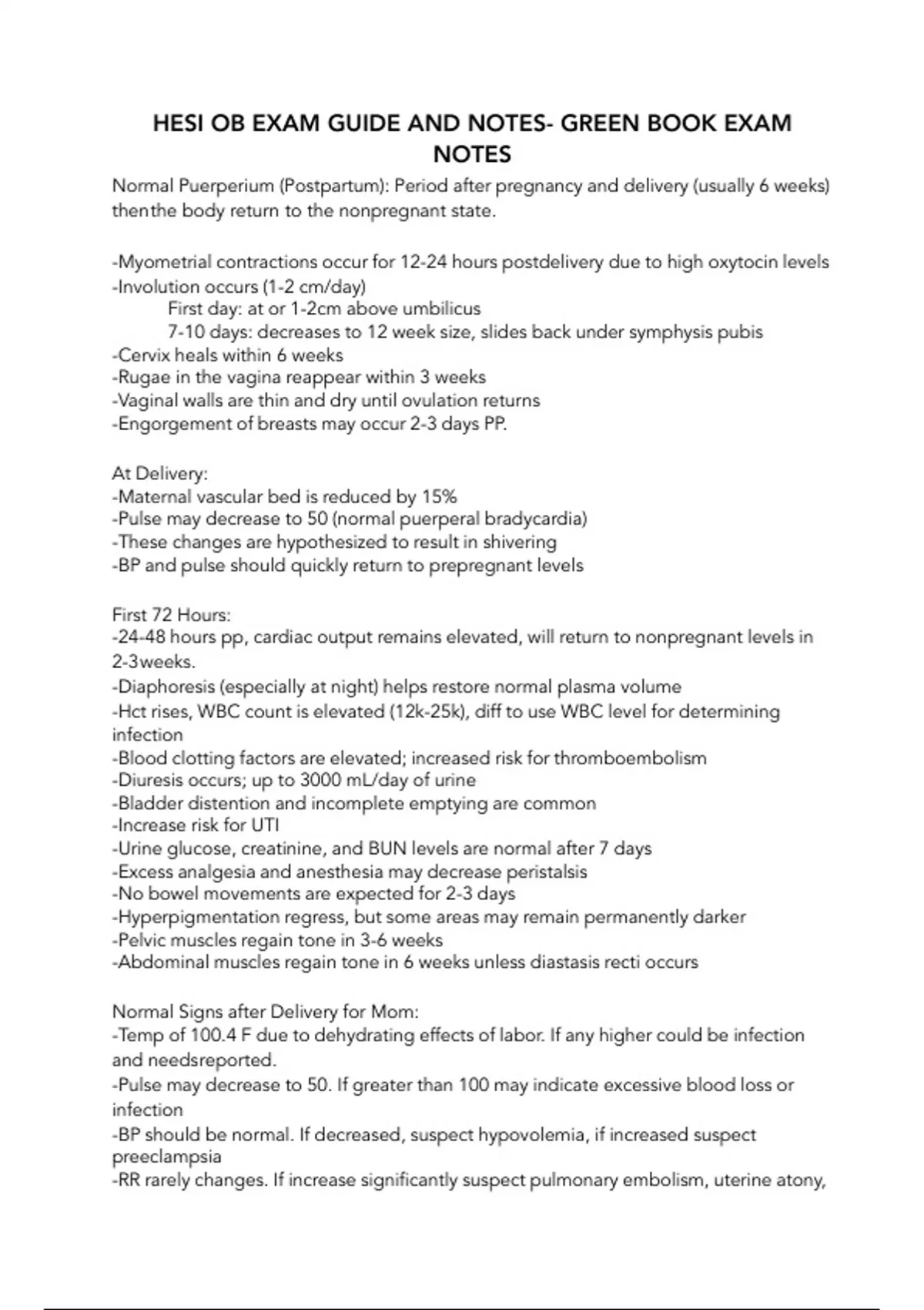 HESI OB EXAM GUIDE AND NOTES- GREEN BOOK EXAM NOTES