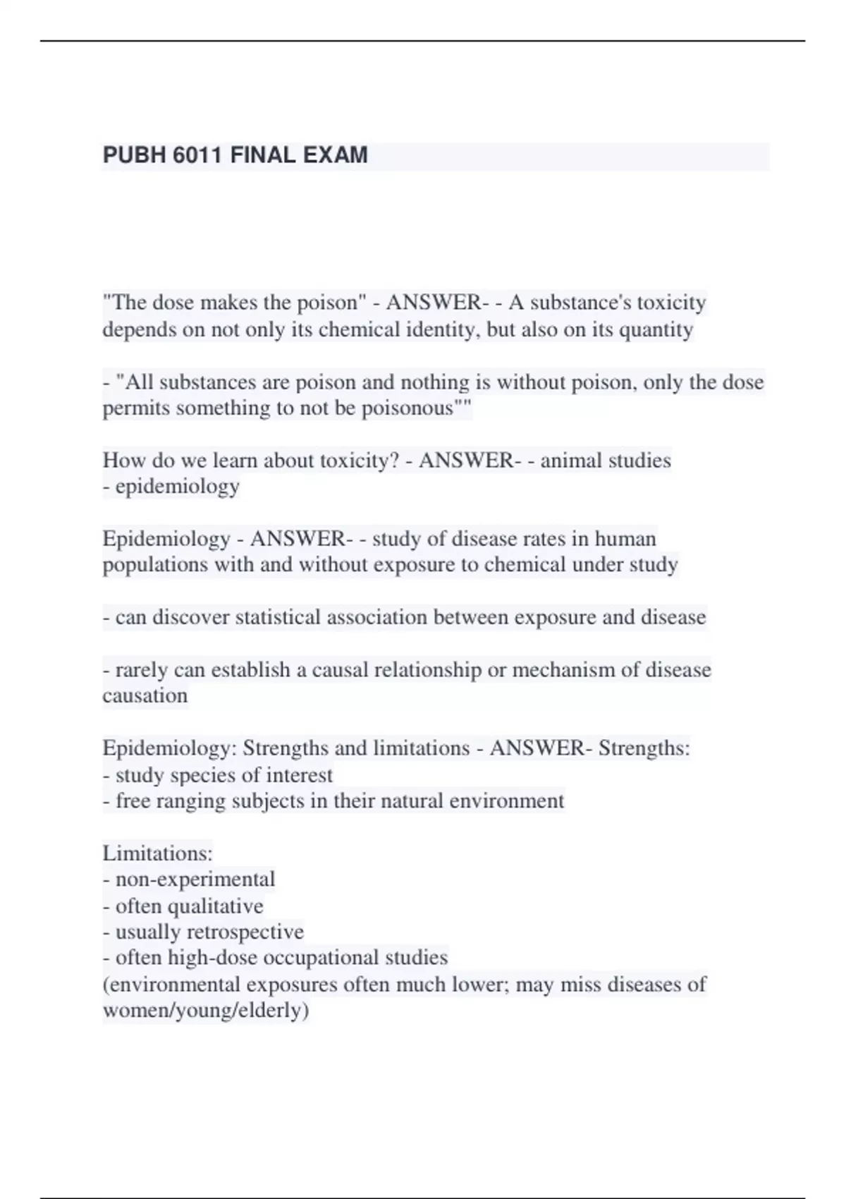 PUBH 6011 FINAL EXAM "The dose makes the poison" - ANSWER- - A substance's toxicity depends on not only its chemical identity, but also on its quantity - "All substances are poison and nothing is without poison, only the dose permits something to not be poisonous"" How do we learn about toxicity? - ANSWER- - animal studies - epidemiology Epidemiology - ANSWER- - study of disease rates in human populations with and without exposure to chemical under study - can discover statistical association between exposure and disease - rarely can establish a causal relationship or mechanism of disease causation Epidemiology: Strengths and limitations - ANSWER- Strengths: - study species of interest - free ranging subjects in their natural environment Limitations: - non-experimental - often qualitative - usually retrospective - often high-dose occupational studies (environmental exposures often much lower; may miss diseases of women/young/elderly) - subject to confounding and bias What is toxicology? - ANSWER- - study of adverse effects in biological systems caused by chemical or physical agents - assess the likelihood of the occurrence of adverse effects - study the nature and mechanisms of adverse effects - uses model to stand in for people Animal testing - ANSWER- - tests on rodents to assess adverse effects - rodents chosen for short life, small size and easy care - tests can address acute, subchronic or chronic toxicity Toxicology animal testing - ANSWER- Strengths: - well controlled (doses, no confounding exposure) - prospective Questions: - generalized across species -high dose to low dose extrapolation - definition of response Dose-response relationship - ANSWER- - toxicity quantified through the dose-response relationship - individual: change in severity of effect with dose - population: change in prop. of population responding with dose --- different for different effects --- shape of curve gives information about pop. variability and tox of the compound Population dose-response function - ANSWER- - focus on a specific endpoint - test multiple individuals (mice or rats usually) at specific doses - at each dose level, individuals either do or don't respond (variation across individuals) - measure proportion of population responding at each dose level or level of response at each dose level - as dose goes up, severity goes up Variation in response to dose - ANSWER- - differences in response due to genes, nutrition, health status, etc. Tolerance distribution - ANSWER- more of the population will respond at higher doses, more of the population has tolerance to low doses How does an agent get into the body - ANSWER- route: - oral - dermal - inhalation timing: - acute (days) - sub-chronic (weeks to months) - chronic (months to years) Equivalent doses - ANSWER- - use mg/kg to make equivalent doses across species Acute toxicity - ANSWER- adverse effects that occur within a short period after exposure to a toxicant; often reversible, usually from a single dose Chronic toxicity - ANSWER- adverse effects that occur some time after exposure to a toxicant or after extended exposure to the toxicant; ex cancer, liver damage, lung fibrosis Local toxicity - ANSWER- toxic effect occurs at the site of exposure (ex pulmonary edema, acid on skin) systemic toxicity - ANSWER- requires absorption and distribution of the toxicant (usually in the blood stream) to susceptible organs where the effect occurs; adverse effect is somewhere other than where the initial exposure occurred Exposure pattern influencing dose response - ANSWER- acute toxicity: happens quickly - usually after 1 dose - include death, CNS effects, irritation, etc. Chronic: - result of prolonged exposure, usually lower doses than acute - organ damage, cancer - eventually it will build up to a point where the adverse effect occurs frequently little relationship between the two Pharmacokinetics influencing dose response - ANSWER- can differ by species, sex, age, nutrition, disease, enzyme induction (prior exposure) - how the body responds to a specific dose/exposure DDT LD50 in rats - ANSWER- - newborn rats have a higher tolerance for DDT - the lower the LD50, the more toxic the chemical is (bc it takes less of it to have effects) - age influences toxicity/response in either direction Species and strain in dose response - ANSWER- - can differ between strains due to different mechanisms of action/different receptors between species - common to assume that humans are the most sensitive when studying and use the most sensitive species to begin studying the chemical LD50 - ANSWER- - dose (mg/kg) lethal to 50% of test animals - determined orally, through inhalation or by dermal exposure LC50 - ANSWER- - concentration (in ppm or mass/volume) lethal to 50% of test animals - something in the water, air, etc. where you can measure the concentration in the environment Subchronic/chronic tox testing - ANSWER- - concerned with long term exposure to lower doses - test for damage to certain organs - damage to functional systems (neuro, immuno, etc.) - test for carcinogenicity Mechanic studies - ANSWER- - study of potential models of action in lab animals (in vivo) or with isolated tissues, cells or components (in vitro) strengths: - compound specific info - understanding biology should improve problems: - difficult to rule out alternative theories - lack necessary data for humans Assessing risks - ANSWER- - personal: risk of walking, driving, etc. - public health - occupational health: setting workplace standards - architects: risk of structure injuring people, earthquakes - medical: risk of side effects from new drugs - dept of transportation: traffic, hazardous material transport