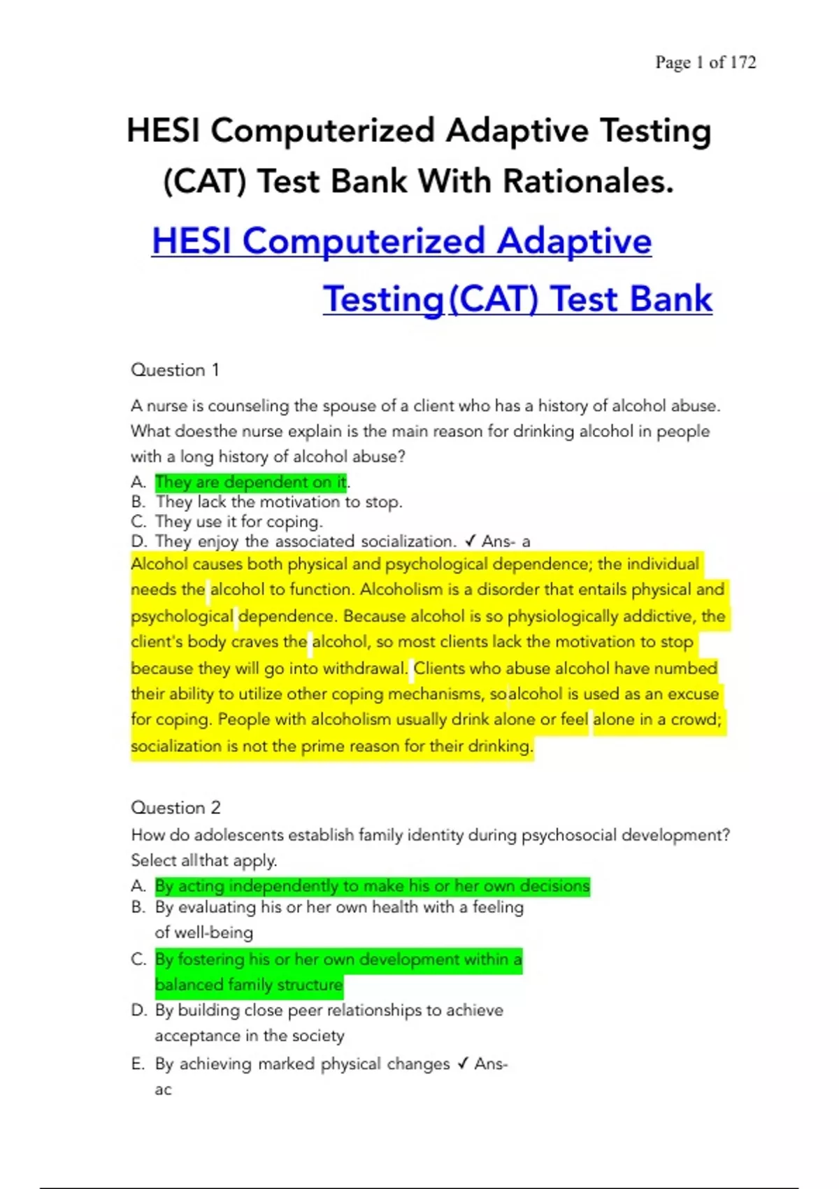 HESI Computerized Adaptive Testing (CAT) Test Bank With Rationales