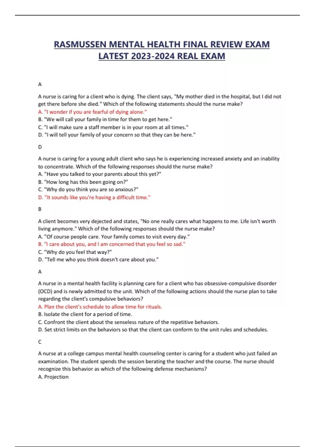 RASMUSSEN MENTAL HEALTH FINAL REVIEW EXAM LATEST REAL EXAM A A nurse is caring for a client who is dying. The client says, "My mother died in the hospital, but I did not get there before she died." Which of the following statements should the nurse make? A. "I wonder if you are fearful of dying alone." B. "We will call your family in time for them to get here." C. "I will make sure a staff member is in your room at all times." D. "I will tell your family of your concern so that they can be here." D A nurse is caring for a young adult client who says he is experiencing increased anxiety and an inability to concentrate. Which of the following responses should the nurse make? A. "Have you talked to your parents about this yet?" B. "How long has this been going on?" C. "Why do you think you are so anxious?" D. "It sounds like you're having a difficult time." B A client becomes very dejected and states, "No one really cares what happens to me. Life isn't worth living anymore." Which of the following responses should the nurse make? A. "Of course people care. Your family comes to visit every day." B. "I care about you, and I am concerned that you feel so sad." C. "Why do you feel that way?" D. "Tell me who you think doesn't care about you." A A nurse in a mental health facility is planning care for a client who has obsessive-compulsive disorder (OCD) and is newly admitted to the unit. Which of the following actions should the nurse plan to take regarding the client's compulsive behaviors? A. Plan the client's schedule to allow time for rituals. B. Isolate the client for a period of time. C. Confront the client about the senseless nature of the repetitive behaviors. D. Set strict limits on the behaviors so that the client can conform to the unit rules and schedules. C A nurse at a college campus mental health counseling center is caring for a student who just failed an examination. The student spends the session berating the teacher and the course. The nurse should recognize this behavior as which of the following defense mechanisms? A. Projection B. Conversion C. Undoing D. Regression C A nurse in a hospital is caring for a client who has agoraphobia. Which of the following statements by the client indicates understanding of the goals of treatment? A. "I can try participating in group therapy every week." B. "I will join a book club in my neighborhood." C. "I plan to sit on a park bench for a few minutes each day." D. "I should avoid entering elevators and other closed spaces." D A nurse asks a client who is suicidal to make a safety contract, but the client declines. Which of the following actions should the nurse identify as the priority? A. Lock the doors to the unit and secure windows so they cannot be opened. B. Provide the client with plastic eating utensils for meals. C. Remove any objects from the client's environment that could be used for self-harm. D. Assign a staff member to stay with the client at all times. D A nurse is caring for a client who is extremely suspicious of the nursing staff and other clients. Which of the following nursing approaches is appropriate when establishing a therapeutic relationship with this client? A. Disclose some personal information to the client to demonstrate approachability. B. Wait for the client to initiate interaction. C. Approach the client frequently throughout the day for brief interactions. D. Adopt a neutral attitude when providing care. C A nurse at a walk-in mental health clinic is assessing a client experiencing severe anxiety. The nurse should recognize the client might exhibit which of the following manifestations? A. Attention-seeking conduct B. Mild difficulty problem solving C. Threatening behavior D. Mild fidgeting A A nurse observes that a client who has depression is sitting alone in the room crying. As the nurse approaches, the client states, "I'm feeling really down and don't want to talk to anyone right now." Which of the following responses should the nurse make? A. "I'll just sit here with you for a few minutes then." B. "It might help you feel better if you talk about it." C. "I understand. I've felt like that before, too." D. "Why are you feeling so down?" B A nurse in a psychiatric unit is admitting a client who attacked a neighbor. The nurse should know that the client can be kept in the hospital after the 72-hr hold is over for which of the following conditions? A. The client is unwilling to accept that treatment is needed. B. The client is a danger to herself or others. C. The client states that she does not like the neighbor. D. The client states that she plans to move out of the state immediately. B A nurse observes a client's spouse sitting alone in the waiting room crying. When approached, the spouse says, "I am really concerned about my husband." Which of the following is a therapeutic nursing response? A. "Did your husband say something to upset you?" B. "Tell me what is concerning you." C. "Your husband is making really good progress." D. "Crying helps us let things out and we feel better." A A nurse is caring for a client who is depressed and refuses to participate in group therapy, or perform activities of daily living. Which of the following nursing statements by the nurse is appropriate? A. "I will assist you in getting out of bed and getting dressed." B. "You can remain in bed until you feel well enough to join the milieu." C. "The unit rules state that you may not remain in bed." D. "If you don't participate in your care, you will not get better." D