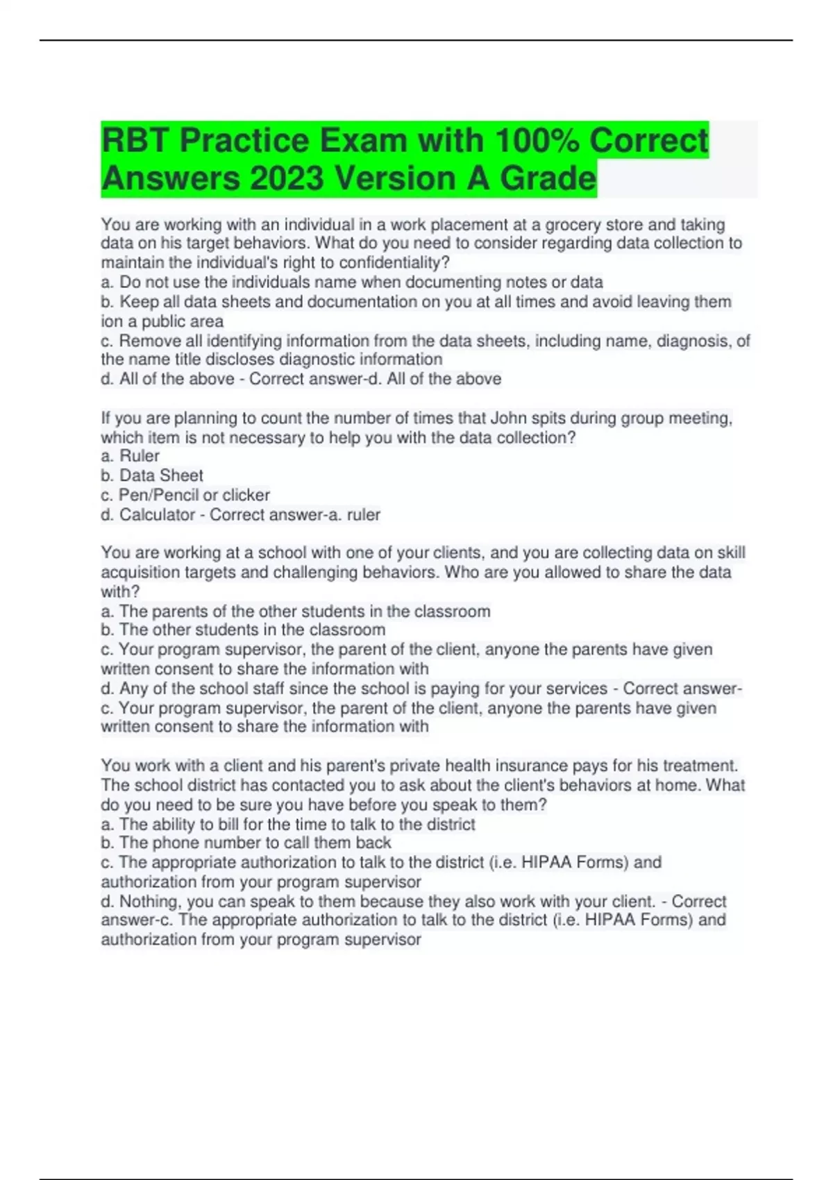RBT Practice Exam with 100% Correct Answers 2023 Version A Grade The data you have taken to track a client's dressing skills is being reviewed at the meeting you are having with the BCBA. The BCBA states that this is not the data she is looking for and informs you of how she would like the data taken. You should ? a. Talk to the other therapists and tell them that you were reprimanded by the BCBA and they should do it the way you are since it is more effective b. Do not change how you take the data, since you have always taken data in that way and it is how you were trained c. Follow the way the BCBA is currently showing you and if you have additional questions ask the BCBA d. Speak to the other therapists to see how they are taking the data and do as they do. - Correct answer-c. Follow the way the BCBA is currently showing you and if you have additional questions ask the BCBA You are instructed to observe a client for 60 minutes, using partial interval recording on nail biting in 5-minute intervals. How would you take this data? a. Mark it if the nail biting occurred anytime within each 5-minute interval b. Mark it only if nail biting occurred for the entire 5-minute interval c. Mark it only if the behavior occurred at the end of each 5-minute interval d. Mark it only if the behavior did not occur at all during each 5-minute interval - Correct answer-a. Mark it if the nail biting occurred anytime within each 5-minute interval Here is the skill acquisition plan for teaching Hannah to pour juice from the pitcher to the cup. 1) gather all materials (juice cup, and napkin) 2) hold your hand over Hannah's hand and prompt her to put it on the pitcher 3) Therapist holds the cup 4) Help Hannah pour the juice into the cup while the therapist holds the cup 5) Prompt Hannah to wipe up anything that spills with the napkin. What do you need in order to be prepared to teach this lesson a. Flash cards b. A pitcher of juice, a cup, a napkin, and a reinforcer c. A clear spot in the kitchen d. All of the above - Correct answer-b. A pitcher of juice, a cup, a napkin, and a reinforcer Which of the following is an example of permanent product recording? a. Taking a spelling test by vocally spelling the words b. Taking a spelling test by giving a thumb up to indicate when a word is spelled correctly c. Taking a spelling test by typing the words on a worksheet and printing it out d. Taking a spelling test and having the student spell the words using sign language - Correct answer-c. Taking a spelling test by typing the words on a worksheet and printing it out Monica, an RBT, is providing training to the parent of one of her clients. While training, the parent asks Monica if she could help him to introduce a new goal to his child. The parent wants to teach his child to start eating new types of food. This has not been discussed with the BCBA on the case yet. Monica should . a. Agreed to work on this during training because it is important to the parents b. Not agree to work on the goal since it has not been discussed first with the supervisor of the program, and instead mention the parents request to her supervisor c. Not agree to work on the goal but provide some referrals get an evaluation from a feeding specialist d. Agree to work on this during training because it is important for children to have a balanced diet and good nutrition - Correct answer-b. Not agree to work on the goal since it has not been discussed first with the supervisor of the program, and instead mention the parents request to her supervisor Your client's rate self-injurious behavior has increased. The previous rate was 1 time per hour and the rate for your last session was 27 times per hour. You should ? a. Contact BCBA immediately and inform her of the behavior change after the session is over b. Contact the other therapists to see if they are documenting the behavior correctly c. Wait and see if the behavior decreases over the next several days d. Tell the parents to cancel sessions for the rest of the week, he is obviously not feeling well and needs a chance to rest. - Correct answer-a. Contact BCBA immediately and inform her of the behavior change after the session is over Which behavior is the easiest to measure? a. Linda's frustration b. Linda shouting "NO". c. Linda's irritation with her chores d. Linda's Stomach ache - Correct answer-b. Linda shouting "NO". Which of the following is an example of a stimulus control transfer procedure? a. Pairing the instructions, "Make a sandwich," with a video model, then fading the video model until the client can make a sandwich when given the instructions only b. Offering choices of a sandwich or salad for lunch c. Giving praise for making a sandwich within a 5-minute interval d. Having the client discriminate between making a sandwich and making popcorn when given the specific instructions - Correct answer-a. Pairing the instructions, "Make a sandwich," with a video model, then fading the video model until the client can make a sandwich when given the instructions only