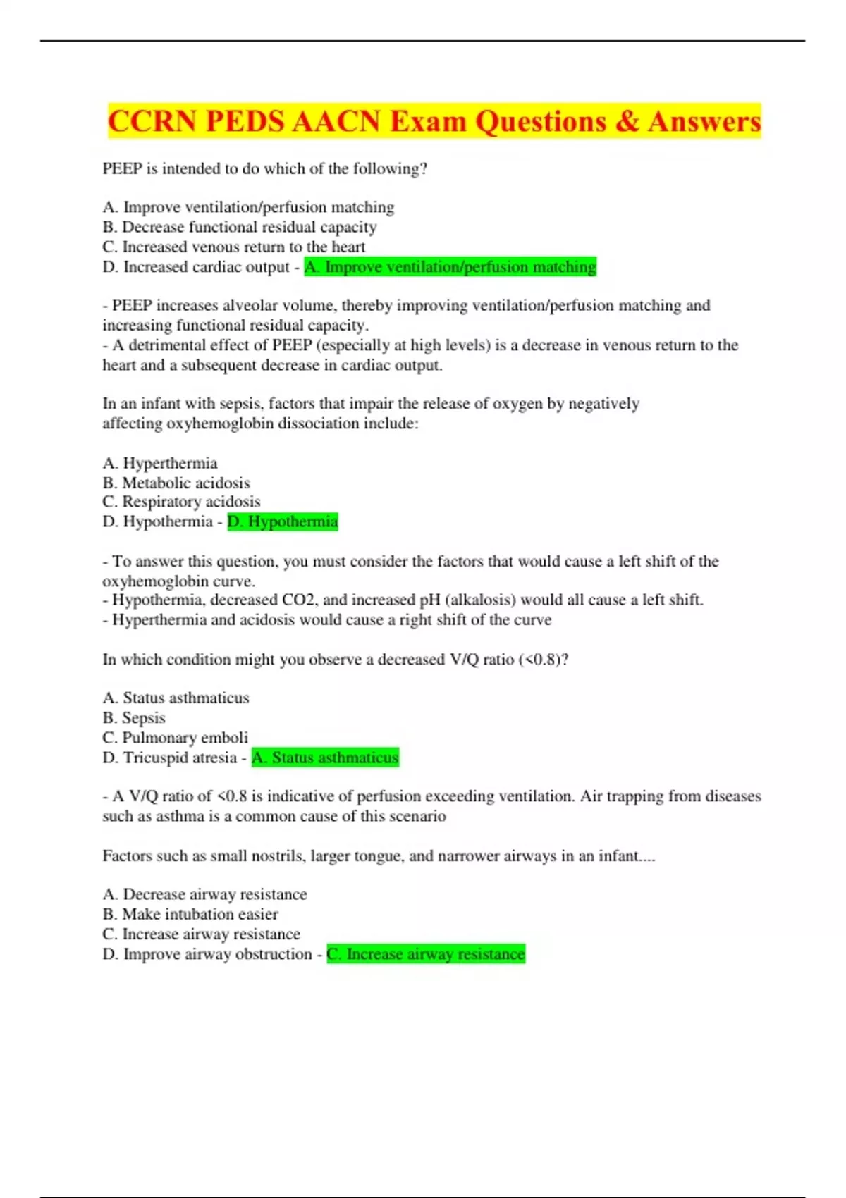 CCRN PEDS AACN Exam Questions & Answers-PEEP is intended to do which of the following? A. Improve ventilation/perfusion matching B. Decrease functional residual capacity C. Increased venous return to the heart D. Increased cardiac output - A. Improve ventilation/perfusion matching - PEEP increases alveolar volume, thereby improving ventilation/perfusion matching and increasing functional residual capacity. - A detrimental effect of PEEP (especially at high levels) is a decrease in venous return to the heart and a subsequent decrease in cardiac output. In an infant with sepsis, factors that impair the release of oxygen by negatively affecting oxyhemoglobin dissociation include: A. Hyperthermia B. Metabolic acidosis C. Respiratory acidosis D. Hypothermia - D. Hypothermia - To answer this question, you must consider the factors that would cause a left shift of the oxyhemoglobin curve. - Hypothermia, decreased CO2, and increased pH (alkalosis) would all cause a left shift. - Hyperthermia and acidosis would cause a right shift of the curve In which condition might you observe a decreased V/Q ratio (<0.8)? A. Status asthmaticus B. Sepsis C. Pulmonary emboli D. Tricuspid atresia - A. Status asthmaticus - A V/Q ratio of <0.8 is indicative of perfusion exceeding ventilation. Air trapping from diseases such as asthma is a common cause of this scenario Factors such as small nostrils, larger tongue, and narrower airways in an infant.... A. Decrease airway resistance B. Make intubation easier C. Increase airway resistance D. Improve airway obstruction - C. Increase airway resistance - There are a number of factors that increase airway resistance and obstruction in young infants, including their larger heads and tongues, smaller nostrils, decreased muscle tone, and narrower airways. - Intubation is more difficult because of an anterior larynx and narrow cricoid ring. Indications that a patient is ready to wean from mechanical ventilation include: A. Hemodynamic instability B. Adequate cough and gag reflexes C. Persistent coma D. PEEP > 8 - B. Adequate cough and gag reflexes - Before being extubated, a child needs to have an adequate level of consciousness to protect his or her airway. This includes having an adequate cough and gag; hemodynamic stability (not instability); and a PEEP <5, with an oxygen requirement generally less than an FiO2 of 0.4. A toddler who was found unresponsive in a swimming pool is in respiratory distress. On chest x-ray you see bilateral infiltrates and the PaO2/FiO2 ratio is 190. These findings suggest: A. Aspiration pneumonia B. Viral pneumonia C. Acute respiratory distress syndrome D. Pneumothorax - C. Acute respiratory distress syndrome - This child has signs of acute respiratory distress syndrome (ARDS), which include bilateral infiltrates on chest x-ray, PaO2/FiO2 ratio <200, and pulmonary edema, among other things. - Both aspiration and viral pneumonia may lead to ARDS, but that's not the correct answer for this question. - The symptoms described are not consistent with a pneumothorax. An infant with bronchiolitis is intubated due to an acute respiratory failure. Post-intubation ABG results demonstrate: pH 7.22 PaCO2 62 PaO2 75 HCO3 22 O2 sat 90% This blood gas reflects: A. Metabolic acidosis B. Respiratory acidosis C. Metabolic alkalosis D. Respiratory alkalosis - B. Respiratory acidosis This child's blood gas results include a decreased pH and an increase in PaCO2 — both of which indicate a state of respiratory acidosis. An intubated, mechanically ventilated patient has a sudden decrease in SpO2 from 95% to 78%, and the ventilator is alarming high peak pressures. Your first intervention is to: A. Increase the FiO2 and ventilator rate B. Assess the patency of the endotracheal tube C. Administer a neuromuscular blocking agent D. Prepare to reposition the endotracheal tube - B. Assess the patency of the endotracheal tube