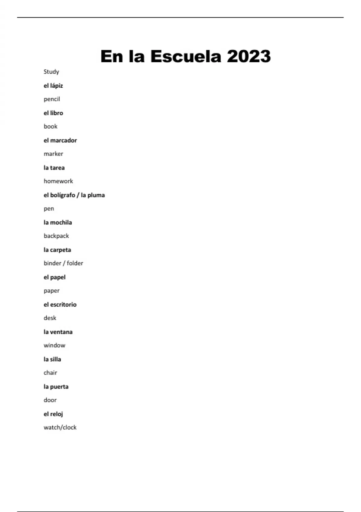 En La Escuela 2023 Study el lápiz pencil el libro book el marcador marker la tarea homework el bolígrafo / la pluma pen la mochila backpack la carpeta binder / folder el papel paper el escritorio desk la ventana window la silla chair la puerta door el reloj watch/clock