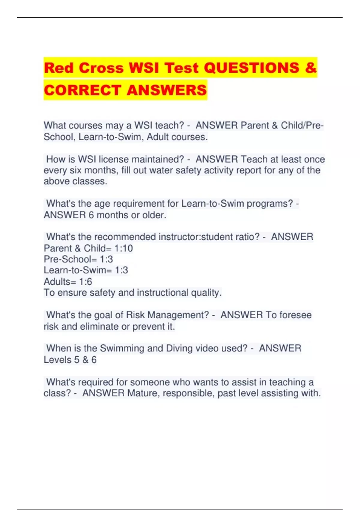 Red Cross WSI Test QUESTIONS & CORRECT ANSWERS What courses may a WSI teach? - ANSWER Parent & Child/PreSchool, Learn-to-Swim, Adult courses. How is WSI license maintained? - ANSWER Teach at least once every six months, fill out water safety activity report for any of the above classes. What's the age requirement for Learn-to-Swim programs? - ANSWER 6 months or older. What's the recommended instructor:student ratio? - ANSWER Parent & Child= 1:10 Pre-School= 1:3 Learn-to-Swim= 1:3 Adults= 1:6 To ensure safety and instructional quality. What's the goal of Risk Management? - ANSWER To foresee risk and eliminate or prevent it. When is the Swimming and Diving video used? - ANSWER Levels 5 & 6 What's required for someone who wants to assist in teaching a class? - ANSWER Mature, responsible, past level assisting with. Name 5 factors that influence setting goal for learners. - ANSWER Age, disability, level of cognitive ability, and motor skills. Characterize each stage of learning. - ANSWER Cognitive (Early): Associative (Intermediate): Autonomous (Late): What modifications are made for swimmers who learn differently? - ANSWER Reduce class size ad change equipment. Materials a WSI should use to plan for a Learn-to-Swim class. - ANSWER WSI Manual What value do safety topics have in the ARC Learn-to-Swim program? - ANSWER They're an integral part of every class. How is repetition important? - ANSWER It helps create muscle memory. Name the requirements of the Basic Water Rescue course. - ANSWER Comfort in chest-deep water. What purpose does "WHALE Tales" serve? - ANSWER They're used to teach safety.