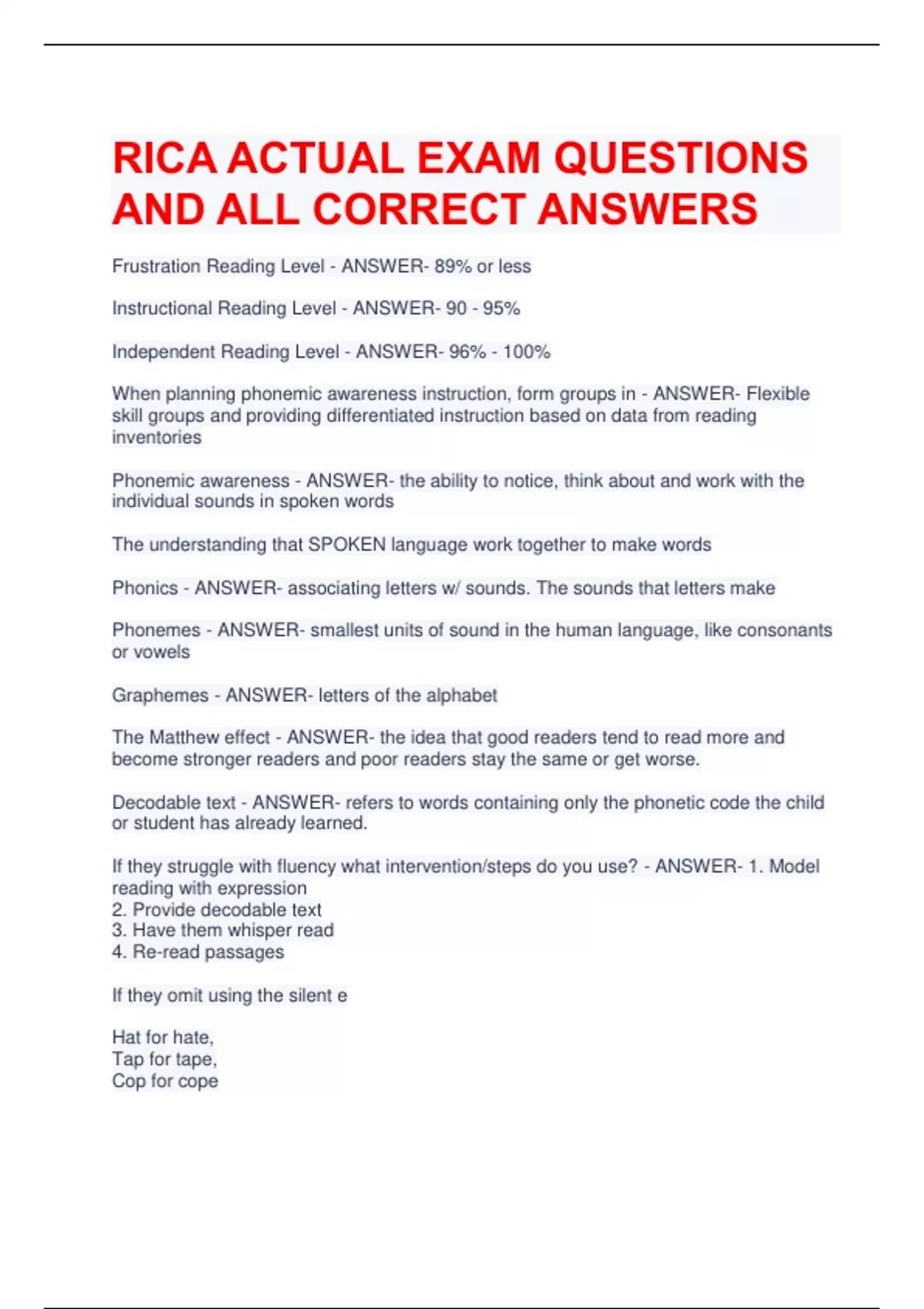 RICA ACTUAL EXAM QUESTIONS AND ALL CORRECT ANSWERS Frustration Reading Level - ANSWER- 89% or less Instructional Reading Level - ANSWER- 90 - 95% Independent Reading Level - ANSWER- 96% - 100% When planning phonemic awareness instruction, form groups in - ANSWER- Flexible skill groups and providing differentiated instruction based on data from reading inventories Phonemic awareness - ANSWER- the ability to notice, think about and work with the individual sounds in spoken words The understanding that SPOKEN language work together to make words Phonics - ANSWER- associating letters w/ sounds. The sounds that letters make Phonemes - ANSWER- smallest units of sound in the human language, like consonants or vowels Graphemes - ANSWER- letters of the alphabet The Matthew effect - ANSWER- the idea that good readers tend to read more and become stronger readers and poor readers stay the same or get worse. Decodable text - ANSWER- refers to words containing only the phonetic code the child or student has already learned. If they struggle with fluency what intervention/steps do you use? - ANSWER- 1. Model reading with expression 2. Provide decodable text 3. Have them whisper read 4. Re-read passages If they omit using the silent e Hat for hate, Tap for tape, Cop for cope You should..... - ANSWER- Give more explicit instruction around vowel sounds. Explicit instruction - ANSWER- directly instructing on the topic of concern Activities to teach silent vowel sounds - ANSWER- word sorting Word sorting activity - ANSWER- Good for teaching spelling at any grade. It's sorting words into categories like CVC CVVC Make week Take peel Make words activity - ANSWER- ALL GRADES -- to learn spelling patterns and become good decoders. It is also a great hands-on activity to help struggling readers. a k h e n "Make the word .....He" "Make the word.... Hank" Alphabetic principle - ANSWER- the relationship between letters or combinations of letters (graphemes) and sounds (phonemes) How to Promote Independent and At-Home Reading - ANSWER- 1. I + I: interesting books at student's independent reading level 2. SSR 3. Reader/writers workshop. An hour or more a day when children read silently, small groups work on projects, and teacher meets with individual students and groups of kids who have similar needs. One or 2 days a week Story mapping is used for - ANSWER- Comprehension of stories. A story map is a strategy that uses a graphic organizer to help students learn the elements of a book or story. By identifying story characters, plot, setting, problem and solution, students read carefully to learn the details. Digraphs - ANSWER- When two letters are used to spell a single sound, for example the ph in phone. Two letters, one sound (/ch/, /th/, /sh/, /oa/, /ea/) Diphthong - ANSWER- A long vowel consisting of two sounds. Two letters, one sound /oi/, /ow/ Fluency - ANSWER- accuracy, rate, and expression Fluency Strategies - ANSWER- Readers Theatre, Parner Reading, Choral Reading, and Listening Center. Readers Theatre - ANSWER- Helps fluency Students are actors and they read aloud from a script based on a story they are reading Choral Reading - ANSWER- Helps fluency Students read aloud at the same time as the teacher Different Levels of Comprehension - ANSWER- 1. Literal - The answer can be found "right there" in the text (it is stated explicitly) 2. Inferential - The reader must understand beyond what is "right there" in the text (How? Why?) 3. Evaluative - The reader must distinguish fact from opinion, detect bias. Letter Recognition strategies - ANSWER- 1. Display large letter on blackboard, students whose name starts with that letter line up underneath it. 2. Sing the Alphabet- Sing song slowly as point to letter 3. Tactile and Kinesthetic Methods: tactile-children make letters from clay or trace their fingers over letters cut from sand paper. Kinesthetic- Pretend to write letters in air that are 2 feet in height. How to teach sight words - ANSWER- 1. Word Banks - A child's personal collection of words that he/she knows well enough to recognize in isolation 2. Word Walls 3. Explicitly teaching of Sight words What are five categories of multi-sensory techniques that teach spelling? - ANSWER- 1. visual: looking & repeated writing (doesn't work for all) 2. visual use of color-use crayons to highlight spelling patterns 3. auditory: child says the letter aloud as he writes 4. kinesthetic-write large letters in the air 5. tactile-use sandpaper, window screens,& shaving cream