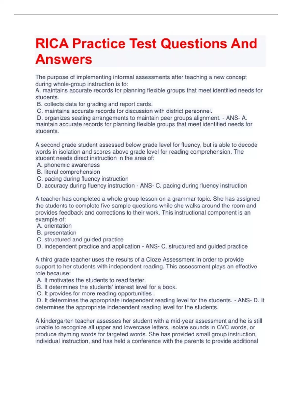 RICA Practice Test Questions And Answers The purpose of implementing informal assessments after teaching a new concept during whole-group instruction is to: A. maintains accurate records for planning flexible groups that meet identified needs for students. B. collects data for grading and report cards. C. maintains accurate records for discussion with district personnel. D. organizes seating arrangements to maintain peer groups alignment. - ANS- A. maintain accurate records for planning flexible groups that meet identified needs for students. A second grade student assessed below grade level for fluency, but is able to decode words in isolation and scores above grade level for reading comprehension. The student needs direct instruction in the area of: A. phonemic awareness B. literal comprehension C. pacing during fluency instruction D. accuracy during fluency instruction - ANS- C. pacing during fluency instruction A teacher has completed a whole group lesson on a grammar topic. She has assigned the students to complete five sample questions while she walks around the room and provides feedback and corrections to their work. This instructional component is an example of: A. orientation B. presentation C. structured and guided practice D. independent practice and application - ANS- C. structured and guided practice A third grade teacher uses the results of a Cloze Assessment in order to provide support to her students with independent reading. This assessment plays an effective role because: A. It motivates the students to read faster. B. It determines the students' interest level for a book. C. It provides for more reading opportunities . D. It determines the appropriate independent reading level for the students. - ANS- D. It determines the appropriate independent reading level for the students. A kindergarten teacher assesses her student with a mid-year assessment and he is still unable to recognize all upper and lowercase letters, isolate sounds in CVC words, or produce rhyming words for targeted words. She has provided small group instruction, individual instruction, and has held a conference with the parents to provide additional support in the home. What is the next step the teacher should take to ensure the student can obtain progress in these areas? A. Ask the principal to retain the student, due to lack of understanding grade level concepts. B. Meet with a school-based team, consisting of administrators, support personnel, select teachers, and reading coach to determine various strategies that can be used to support the student with mastering grade appropriate skills. C. Transfer student to a different teacher that may have better strategies for teaching the student. D. Provide homework packets that the parents can use at home to reinforce learning because the teacher has done all that she can do. - ANS- B. Meet with a school-based team, consisting of administrators, support personnel, select teachers, and reading coach to determine various strategies that can be used to support the student with mastering grade appropriate skills. The purpose of an entry-level assessment is to determine: A. long term planning for the organization of small groups, determine the selection of appropriate instructional tools, create a comprehensive learning environment, and aligning student needs to CA State Standards. B. if the students mastered all of the grade level standards in the previous year. C. student retention of information over the summer. D. long term groupings for small group and individual instruction. - ANS- A. long term planning for the organization of small groups, determine the selection of appropriate instructional tools, create a comprehensive learning environment, and aligning student needs to CA State Standards. Prior to administering a standardized test to a student with a learning disability, it is imperative that the teacher thoroughly reads the student's IEP to determine: A. if the wording of the test needs to be modified. B. if the student is capable of taking the test. C. if the student should take an assessment that is at their instructional level. D. the modifications that must be implemented during the testing period. - ANS- D. the modifications that must be implemented during the testing period. In the beginning of the year, a fourth grade teacher received the standardized test result for his class. The data displayed that 72% of his students scored below basic in the area of reading comprehension. The most effective step the teacher should take before implementing instruction is: A. have a meeting with the previous teachers of his students to determine what skills were taught and what problems they encountered when teaching their class. B. provide students with multiple assessments that focus on individual skills each week. C. provide students with an entry-level assessment in order to determine the strengths and weaknesses each student has in the area of reading. D. have students write a journal entry on why they have difficulties with understanding reading comprehension questions. - ANS- C. provide students with an entry-level assessment in order to determine the strengths and weaknesses each student has in the area of reading. The assessments that is used in order to determine accurate reading levels for expository texts are: A. CLOZE tests B. Data retrieval charts C. Reading Logs D. Read Alouds - ANS- A. CLOZE tests The most effective method of communicating a student's performance on an assessment is to: A. post all student scores on a chart and place it on the bulletin board. B. announce the scores from highest to lowest to the entire classroom. C. conference with individual students and explain how they are showing improvement, as well as identify the areas that need improvement. D. wait for the disbursement of the school report card and explain the reasoning behind each grade with the student and parents. - ANS- C. conference with individual students and ex