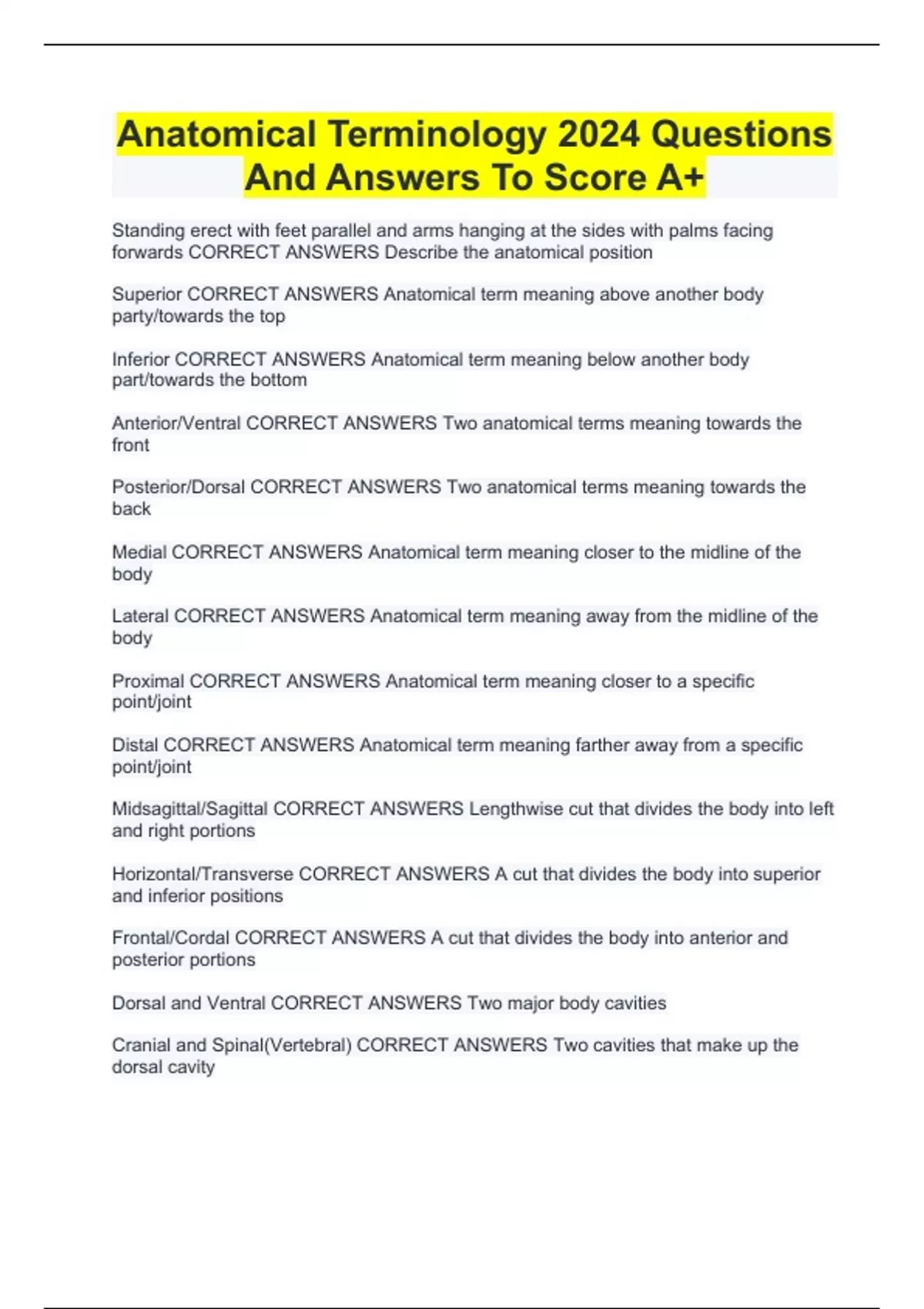 Anatomical Terminology 2024 Questions And Answers To Score A+
