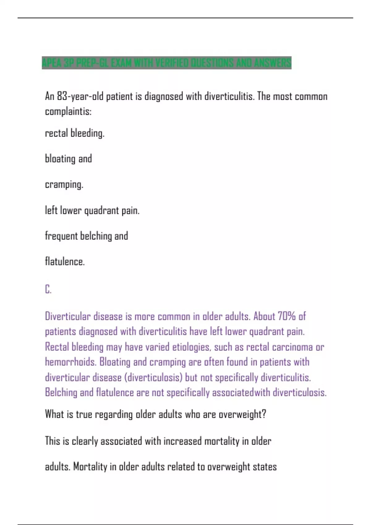 APEA 3P PREP-GL EXAM WITH VERIFIED QUESTIONS AND ANSWERS An 83-year-old patient is diagnosed with diverticulitis. The most common complaint is: rectal bleeding. bloating and cramping. left lower quadrant pain. frequentbelchingand flatulence. C. Diverticular disease is more common in older adults. About 70% of patients diagnosed with diverticulitis have left lower quadrant pain. Rectal bleeding may have varied etiologies, such as rectal carcinoma or hemorrhoids. Bloating and cramping are often found in patients with diverticular disease (diverticulosis) but not specifically diverticulitis. Belching and flatulence arenot specifically associatedwith diverticulosis. What is true regarding older adults who are overweight? This is clearly associated with increased mortality in older adults. Mortality in older adults related to overweight states declines over time.BMI is a good way to assess nutritional status in older adults. There are nopotential metabolic or functional benefits to weight loss in olderadults.B. Overweight and obese states are not as important in predicting mortality in older adults as they are in their younger counterparts. After age 65 years (some studies demonstrate after age 70), weight is less significant in decreasing risk for mortalitythan in younger adults. There are some benefits to weight loss in the obese older adults. One of them is better balance and decreased risk for falls. Others include less sleep apnea, decreased risk of diabetes, and decreased rates of shortness of breath with respiratory and cardiac diseases. The relationship between colon polyps and colon cancer is those polyps: eventually, all become malignant. have a slow progression to colon cancer. have a rapid progression to colon no relationship to colon cancer. B. Colon polyps are usually slow-growing and take a long time to progress to cancer. This is the reason that a colonoscopy does not need to be repeated annually. Whilenot all polyps grow slowly, this is the usual progression. A 5-year-old has been diagnosed with pinworms. He lives with his mother. There areno other members of the household. How should his mother be managed? Reassure the mother that if she develops symptoms, she will need to be treated.Visually assess the mother’s rectum for redness or presence of worms. Have the mother collect a stool specimen and send it to the laboratory. Perform the “scotchtape” test andlook at the collection under the microscope.D. The diagnosis of pinworms (Enterobiasis) is made by using a piece of scotch tape ona tongue depressor. It is touched against the patient’s rectum. The greatest yield of eggs will occur during the nighttime or early AM. Eggs will be found here if they are present. Worms and eggs are rarely found in stool specimens, so this is not a good plan. When the scotch tape is examined under a low power microscope, the eggs will be easily visualized since they are large and bean shaped. The finding of an adult worm would confirm the diagnosis. These are large enough to be seen with the naked eye. If the mother is symptomatic, she should be treated with or withouta rectal exam. It is very likely she is infected. A patient has been diagnosed with hepatitis B. The most commonly reported riskfactor is: drinking contaminated g contaminated food. exposure toblood. sexual exposure. D. Hepatitis B is transmitted by blood and body fluids. While exposure to infected blood or blood products would significantly increase the risk of infection in unvaccinated people, this is much less likely than becoming infected via sexual exposure or IV drug use. Hepatitis A is transmitted via fecal-oral routes. Drinkingcontaminated water and eating contaminated food implicate hepatitis A as the etiologic agent. The three most common causes of bacterial diarrhea in the US are Salmonella,Campylobacter, and: E. coli. Enteroviru s.Yersinia. Shigell a.D. Shigella will be shed continuously in the stool and should be easily identified on stool culture. When bacterial gastroenteritis is suspected, a stool specimen could beordered for confirmation. Generally, these three pathogens are easily identified if they are present. Enterovirus produces a viral form of diarrhea. Yersinia produces the deadly disease called bubonic plague. E. coli is atypical colonic pathogen. What medication used to treat patients who have GERD provides the fastest relief ofheartburn symptoms? Calcium carbonate Ranitidine Amantadine Pantoprazole A. Calcium carbonate is an antacid. It provides rapid changes in gastric pH. This provides relief that can be noticed immediately. The increase in pH lasts for about30 minutes and corresponds with resolution of symptoms. However, as pH decreases within 30 minutes, symptoms may return. Ranitidine is an H2 blocker. Itprovides relief in 1-2 hours. This usually lasts for about 6-12 hours. Amantadine is an antiviral not used to treat GERD. Pantoprazole is a proton pump inhibitor. This provides relief after several hours or days of daily consumption