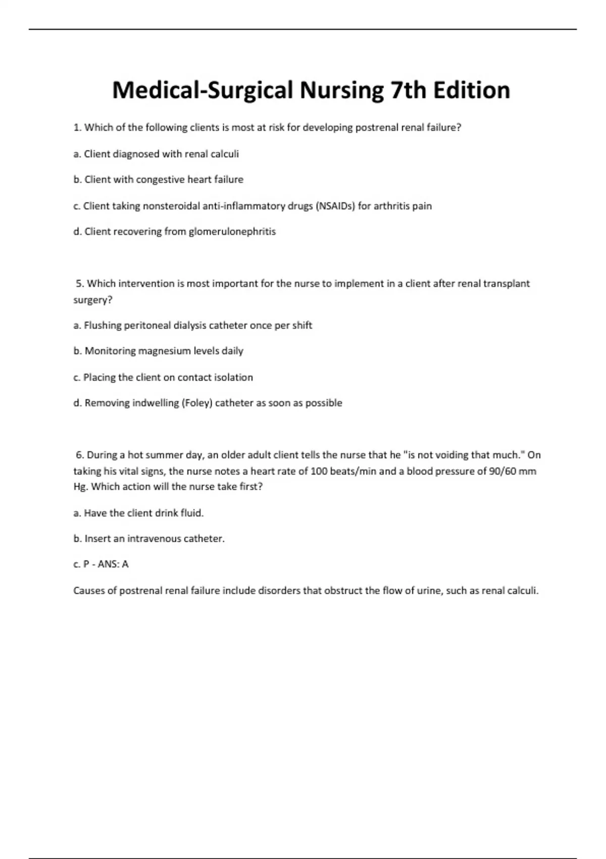 1. Which of the following clients is most at risk for developing postrenal renal failure? a. Client diagnosed with renal calculi b. Client with congestive heart failure c. Client taking nonsteroidal anti-inflammatory drugs (NSAIDs) for arthritis pain d. Client recovering from glomerulonephritis 5. Which intervention is most important for the nurse to implement in a client after renal transplant surgery? a. Flushing peritoneal dialysis catheter once per shift b. Monitoring magnesium levels daily c. Placing the client on contact isolation d. Removing indwelling (Foley) catheter as soon as possible 6. During a hot summer day, an older adult client tells the nurse that he "is not voiding that much." On taking his vital signs, the nurse notes a heart rate of 100 beats/min and a blood pressure of 90/60 mm Hg. Which action will the nurse take first? a. Have the client drink fluid. b. Insert an intravenous catheter. c. P - ANS: A Causes of postrenal renal failure include disorders that obstruct the flow of urine, such as renal calculi.