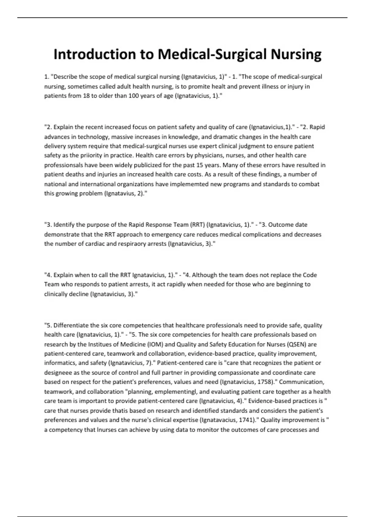 1. "Describe the scope of medical surgical nursing (Ignatavicius, 1)" - 1. "The scope of medical-surgical nursing, sometimes called adult health nursing, is to promite healt and prevent illness or injury in patients from 18 to older than 100 years of age (Ignatavicius, 1)." "2. Explain the recent increased focus on patient safety and quality of care (Ignatavicius,1)." - "2. Rapid advances in technology, massive increases in knowledge, and dramatic changes in the health care delivery system require that medical-surgical nurses use expert clinical judgment to ensure patient safety as the priiority in practice. Health care errors by physicians, nurses, and other health care professionsals have been widely publicized for the past 15 years. Many of these errors have resulted in patient deaths and injuries an increased health care costs. As a result of these findings, a number of national and international organizations have implememted new programs and standards to combat this growing problem (Ignatavius, 2)." "3. Identify the purpose of the Rapid Response Team (RRT) (Ignatavicius, 1)." - "3. Outcome date demonstrate that the RRT approach to emergency care reduces medical complications and decreases the number of cardiac and respiraory arrests (Ignatavicius, 3)." "4. Explain when to call the RRT Ignatavicius, 1)." - "4. Although the team does not replace the Code Team who responds to patient arrests, it act rapidly when needed for those who are beginning to clinically decline (Ignatavicius, 3)." "5. Differentiate the six core competencies that healthcare professionals need to provide safe, quality health care (Ignatavicius, 1)." - "5. The six core competencies for health care professionals based on research by the Institues of Medicine (IOM) and Quality and Safety Education for Nurses (QSEN) are patient-centered care, teamwork and collaboration, evidence-based practice, quality improvement, informatics, and safety (Ignatavicius, 7)." Patient-centered care is "care that recognizes the patient or designeee as the source of control and full partner in providing compassionate and coordinate care based on respect for the patient's preferences, values and need (Ignatavicius, 1758)." Communication, teamwork, and collaboration "planning, emplementingl, and evaluating patient care together as a health care team is important to provide patient-centered care (Ignatavicius, 4)." Evidence-based practices is " care that nurses provide thatis based on research and identified standards and considers the patient's preferences and values and the nurse's clinical expertise (Ignatavacius, 1741)." Quality improvement is " a competency that lnurses can achieve by using data to monitor the outcomes of care processes and using imporovement methods to designs and test changes to continuously improve the qualit and safety of health care systems (Ignatavicius, 1762)." Informatices is "a specialized computer science that involves using information and technology to communicate, manage knowledge, mitigate error, and support decision making, (Ignativicius, 1748)." Safety involves "minimizing risk of harm to patients (Ignativicius, 6)."