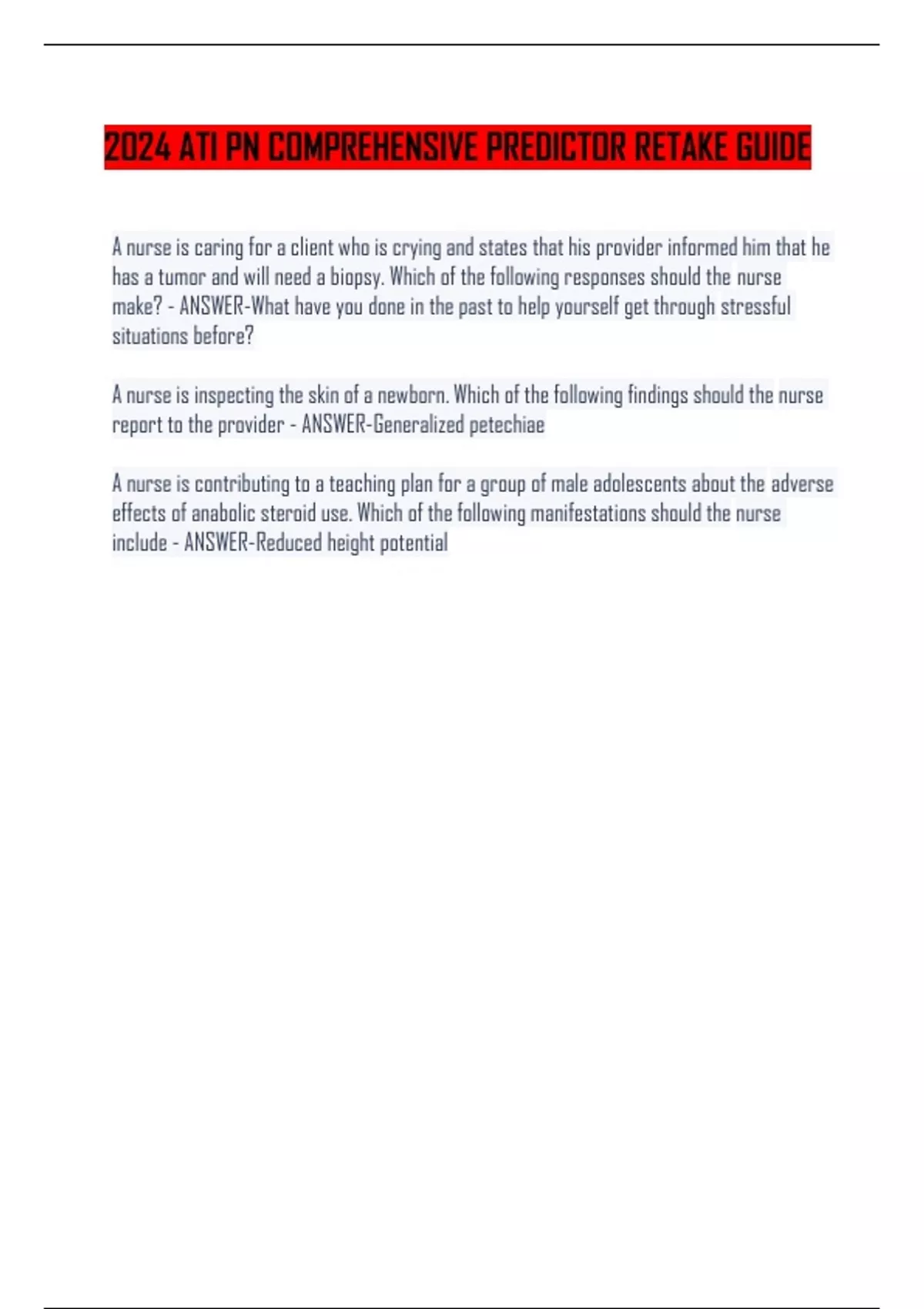 2024 ATI PN COMPREHENSIVE PREDICTOR RETAKE GUIDE A nurse is caring for a client who is crying and states that his provider informed him that he has a tumor and will need a biopsy. Which of the following responses should the nurse make? - ANSWER-What have you done in the past to help yourself get through stressful situations before? A nurseis inspecting theskinofanewborn. Which of thefollowing findings should the nurse report to the provider - ANSWER-Generalized petechiae A nurse is contributing to a teaching plan for a group of male adolescents about the adverse effects of anabolic steroiduse. Which of thefollowing manifestations should the nurse include - ANSWER-Reduced height potential A nurse is reinforcing teaching with an older adult client who has a severe left sided heart failure. Whichof thefollowingstatements should thenurse make - ANSWER-Rest 15 minutes between activities A nurseis caringfor aclient whois crying and states thathis provider informedhim that he has a tumor and will need a biopsy. Which of the following responses should the nurse make? - ANSWER-What have you done in the past to help yourself get through stressful situations before? A nurseis inspecting theskinofanewborn. Which of thefollowing findings should the nurse report to the provider - ANSWER-Generalized petechiae A nurse is contributing to a teaching plan for a group of male adolescents about the adverse effects of anabolic steroiduse. Which of thefollowing manifestations should the nurse include - ANSWER-Reduced height potential A nurse is reinforcing teaching with an older adult client who has a severe left sided heart failure. Whichof thefollowingstatements should thenurse make - ANSWER-Rest 15 minutes between activities A nurseis caringfor aclient whois crying and states thathis provider informedhim that he has a tumor and will need a biopsy. Which of the following responses should the nurse make? - ANSWER-What have you done in the past to help yourself get through stressful situations before? A nurseis inspecting theskinofanewborn. Which of thefollowing findings should the nurse report to the provider - ANSWER-Generalized petechiae A nurse is contributing to a teaching plan for a group of male adolescents about the adverse effects of anabolic steroiduse. Which of thefollowing manifestations should the nurse include - ANSWER-Reduced height potential A nurse is reinforcing teaching with an older adult client who has a severe left sided heart failure. Whichof thefollowingstatements should thenurse make - ANSWER-Rest 15 minutes between activities A nurseis caringfor aclient whois crying and states thathis provider informedhim that he has a tumor and will need a biopsy. Which of the following responses should the nurse make? - ANSWER-What have you done in the past to help yourself get through stressful situations before? A nurseis inspecting theskinofanewborn. Which of thefollowing findings should the nurse report to the provider - ANSWER-Generalized petechiae A nurse is contributing to a teaching plan for a group of male adolescents about the adverse effects of anabolic steroiduse. Which of thefollowing manifestations should the nurse include - ANSWER-Reduced height potential A nurse is reinforcing teaching with an older adult client who has a severe left sided heart failure. Whichof thefollowingstatements should thenurse make - ANSWER-Rest 15 minutes between activities A nurseis caringfor aclient whois crying and states thathis provider informedhim that he has a tumor and will need a biopsy. Which of the following responses should the nurse make? - ANSWER-What have you done in the past to help yourself get through stressful situations before? A nurseis inspecting theskinofanewborn. Which of thefollowing findings should the nurse report to the provider - ANSWER-Generalized petechiae A nurse is contributing to a teaching plan for a group of male adolescents about the adverse effects of anabolic steroiduse. Which of thefollowing manifestations should the nurse include - ANSWER-Reduced height potential A nurse is reinforcing teaching with an older adult client who has a severe left sided heart failure. Whichof thefollowingstatements should thenurse make - ANSWER-Rest 15 minutes between activities A nurseis caringfor aclient whois crying and states thathis provider informedhim that he has a tumor and will need a biopsy. Which of the following responses should the nurse make? - ANSWER-What have you done in the past to help yourself get through stressful situations before? A nurseis inspecting theskinofanewborn. Which of thefollowing findings should the nurse report to the provider - ANSWER-Generalized petechiae A nurse is contributing to a teaching plan for a group of male adolescents about the adverse effects of anabolic steroiduse. Which of thefollowing manifestations should the nurse include - ANSWER-Reduced height potential