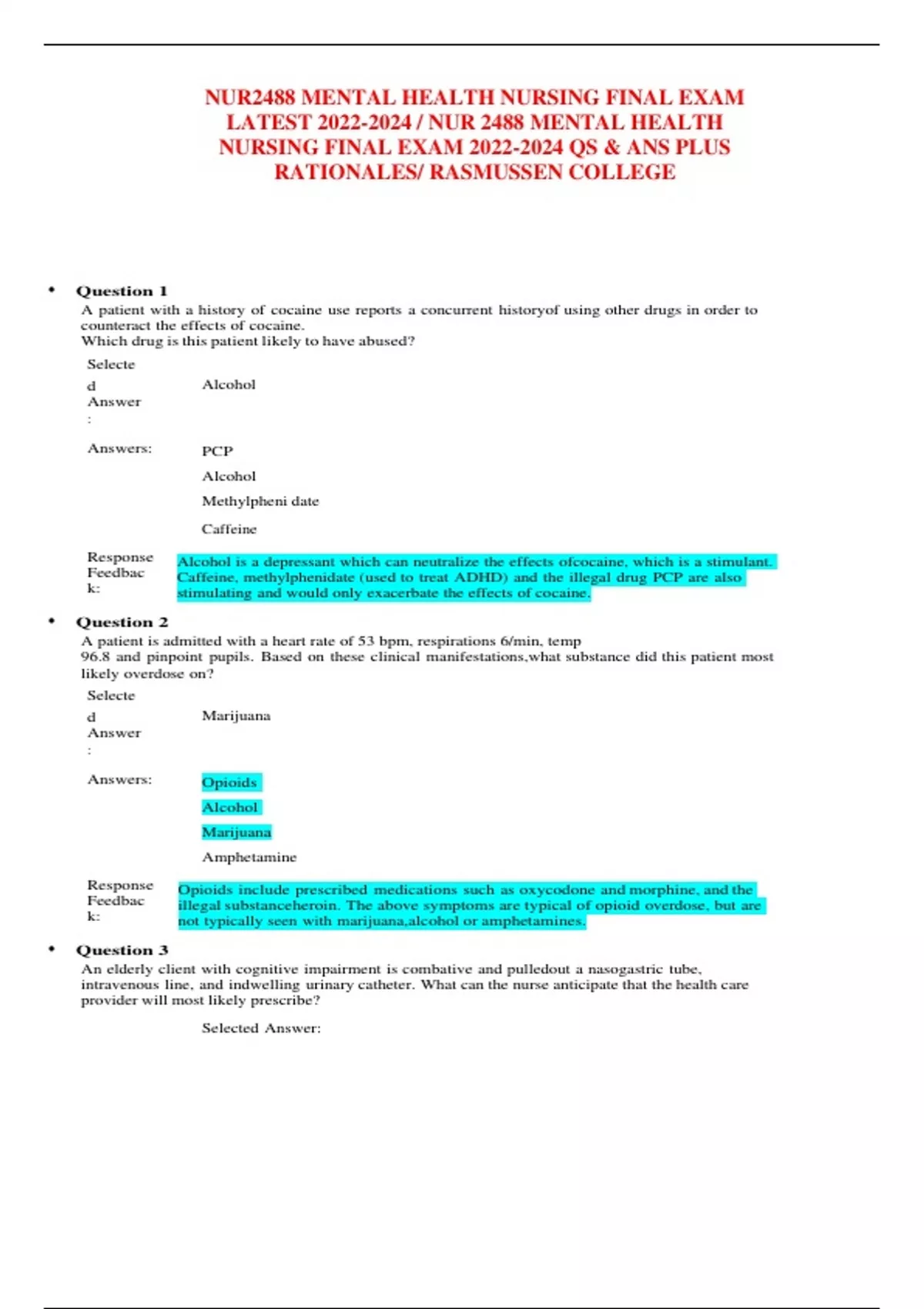 NUR2488 MENTAL HEALTH NURSING FINAL EXAM LATEST / NUR 2488 MENTAL HEALTH NURSING FINAL EXAM QS & ANS PLUS RATIONALES/ RASMUSSEN COLLEGE • Question 1 A patient with a history of cocaine use reports a concurrent historyof using other drugs in order to counteract the effects of cocaine. Which drug is this patient likely to have abused? Selecte d Answer : Alcohol Answers: PCP Alcohol Methylpheni date Caffeine Response Feedbac k: Alcohol is a depressant which can neutralize the effects ofcocaine, which is a stimulant. Caffeine, methylphenidate (used to treat ADHD) and the illegal drug PCP are also stimulating and would only exacerbate the effects of cocaine. • Question 2 A patient is admitted with a heart rate of 53 bpm, respirations 6/min, temp 96.8 and pinpoint pupils. Based on these clinical manifestations,what substance did this patient most likely overdose on? Selecte d Answer : Marijuana Answers: Opioids Alcohol Marijuana Amphetamine Response Feedbac k: Opioids include prescribed medications such as oxycodone and morphine, and the illegal substanceheroin. The above symptoms are typical of opioid overdose, but are not typically seen with marijuana,alcohol or amphetamines. • Question 3 An elderly client with cognitive impairment is combative and pulledout a nasogastric tube, intravenous line, and indwelling urinary catheter. What can the nurse anticipate that the health care provider will most likely prescribe? Selected Answer: A a selective serotonin reuptakeinhibitor Answers: A small dose of a selective serotonin reuptake inhibitor A large dose of a benzodiazepine A maintenance dose ofbuspirone A small dose of an atypical antipsychotic Response Feedback : Aggressive behavior can be safely managed by antipsychotic medication. Initial dosing should be small and raised cautiously until behavior is controlled. Selectiveserotonin reuptake inhibitors are not indicated for aggressive behavior. If a benzodiazepine is used, the initialdose should be low. Buspirone is not effective if given on an as-needed basis. It is administered in small divided doses daily to control agitation. • Question 4 A nursing care plan contains the intervention “monitor for complications of refeeding syndrome.” Which body system should a nurse most closely monitor for clinical manifestations of dysfunction? Selecte d Answer : Central nervous Answers: Renal Central nervous Endocrine Cardiovascu lar Response Feedbac k: Refeeding resulting in too-rapid weight gain can overwhelm the heart, resulting in cardiovascular collapse;thus focused assessment becomes a necessity to ensure patient physiological integrity. The other body systems arenot initially involved in the refeeding syndrome.