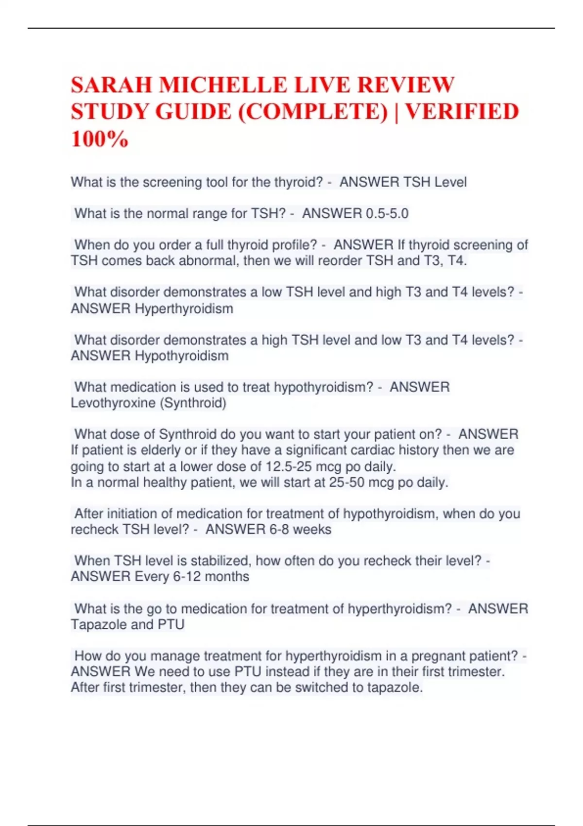 SARAH MICHELLE LIVE REVIEW STUDY GUIDE (COMPLETE) | VERIFIED 100% What is the screening tool for the thyroid? - ANSWER TSH Level What is the normal range for TSH? - ANSWER 0.5-5.0 When do you order a full thyroid profile? - ANSWER If thyroid screening of TSH comes back abnormal, then we will reorder TSH and T3, T4. What disorder demonstrates a low TSH level and high T3 and T4 levels? - ANSWER Hyperthyroidism What disorder demonstrates a high TSH level and low T3 and T4 levels? - ANSWER Hypothyroidism What medication is used to treat hypothyroidism? - ANSWER Levothyroxine (Synthroid) What dose of Synthroid do you want to start your patient on? - ANSWER If patient is elderly or if they have a significant cardiac history then we are going to start at a lower dose of 12.5-25 mcg po daily. In a normal healthy patient, we will start at 25-50 mcg po daily. After initiation of medication for treatment of hypothyroidism, when do you recheck TSH level? - ANSWER 6-8 weeks When TSH level is stabilized, how often do you recheck their level? - ANSWER Every 6-12 months What is the go to medication for treatment of hyperthyroidism? - ANSWER Tapazole and PTU How do you manage treatment for hyperthyroidism in a pregnant patient? - ANSWER We need to use PTU instead if they are in their first trimester. After first trimester, then they can be switched to tapazole. What medication class is used to treat symptoms of hyperthyroidism? - ANSWER Beta-blockers- these help manage tachycardia and palpitations What are 2 other treatments for the hyperthyroidism? - ANSWER Thyroidectomy and radioactive iodine What labs are used to measure and evaluate kidney function? - ANSWER GFR, BUN, Creatinine What lab value is most accurate description of kidney function? - ANSWER GFR- this is going to tell us how the kidneys are filtering the blood and how well they are removing waste. What is a normal GFR value? - ANSWER >90 What GFR value indicates an absolute need to start a patient on dialysis? - ANSWER <15- this means that patient is in CKD stage 5 What is the second most important lab value to measure kidney function? - ANSWER Creatinine What is creatinine? - ANSWER A waste product in the blood. If your kidneys are functioning properly, then this waste product is removed by your kidneys. When kidney function decreases, your creatinine level starts to rise. What is a normal creatine value? - ANSWER Around 1 Why is BUN least telling for kidney function? - ANSWER Blood urea nitrogen is a normal waste product when your body breaks down urea. However, this is not specific to the kidneys. It can also indicate liver issues. What is a normal BUN level? - ANSWER 10-20 With which first-line BP medication do we want to check the BUN/Cr? - ANSWER ACE Inhibitors What finding on a UA id indicative of true kidney damage? - ANSWER Casts- WBC or RBC casts always need to be referred out When do we screen for microalbumin in the urine? - ANSWER We're always going to screen when DM and HTN is first diagnosed. What are the most common causes of CKD? - ANSWER HTN and DM Why is it important to perform early screening for microalbumin in the urine? - ANSWER Patients who have mild kidney damage do not have symptoms, this screening will ideally identify damage early and prevent progression. What stage of CKD do patients show true symptoms? - ANSWER Stage 3 or worse How often are we screening for micro albumin? - ANSWER Bare minimum is going to be annually for patients with DM or HTN or both. What is the normal range of microalbumin? - ANSWER < 30 What is the most common symptom of all anemias? - ANSWER Fatigue What is a normal hemoglobin level? - ANSWER 12-18 Women are on the lower end, and men are on the higher end What is a normal hemoglobin to hematocrit ratio? - ANSWER 3 to 1 36-54% What does MCV stand for? - ANSWER mean corpuscular volume What is a normal MCV? - ANSWER 80-100 What does low MCV indicate? - ANSWER Microcytic anemias What is the most common microcytic anemia? - ANSWER Iron deficiency anemia What is the biggest risk faction for the development of IDA is int he first year of life? - ANSWER The ingestion of cow's milk What does high MCV levels indicate? - ANSWER Microcytic anemia What are the most common microcytic anemias? - ANSWER B12 and folate What symptoms are common with B12 deficiency anemia? - ANSWER Neuro symptoms- the most common symptom is parasthesia What surgery typically leads to B12 deficiency anemia? - ANSWER Gastrectomy patients- who have part of their stomach removed Why do gastrectomy patients typically have B12 deficiency anemia? - ANSWER In order for B12 to be absorbed, it needs to be able to combine with intrinsic factor, which is produced in the stomach. If we remove a large portion of the stomach then we lose a lot of that intrinsic factor. What diabetes medication used long term can also lead to B12 deficiency? - ANSWER Metformin What is an abnormal lead level? - ANSWER >5, ideally no lead should be within the body What kind of symptoms may lead intoxication lead to? - ANSWER Cognitive delays and behavioral problems What are the 3 microcytic anemias? - ANSWER LIT Lead Iron Thalassemia What are the 2 macrocytic anemias? - ANSWER FAB Folate and B12 What are the components of a lipid profile? - ANSWER Total cholesterol HDl LDL Triglycerides What's a normal total cholesterol level? - ANSWER <200 What is a normal HDL level? - ANSWER 40-60, the higher the better What is a normal LDL level? - ANSWER <100 What is a normal triglyceride level? - ANSWER <150 How often should you be ordering a standard limpid profile on a patient? - ANSWER Every 5 years unless they are having symptoms, risk factors, on treatment, etc. What is LDL? - ANSWER Bad cholesterol, it is our major culprit in atherosclerosis in clogging up those arteries. What is HDL? - ANSWER Good cholesterol, it is cardio protective and helps remove excess cholesterol from the body. What are some factors that impact our total cholesterol? - ANSWER Smoking, diet,