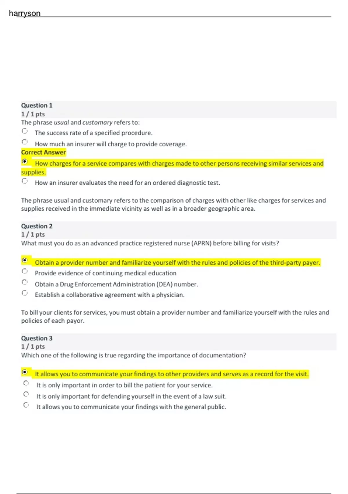 a6d6a1359ef nr 667nr667 fnp capstone practicum and intensive final exam rated aquestions and answers new 202...The phrase usual and customary refersto: The success rate of a specified procedure. How much an insurer will charge to provide coverage. Correct Answer How charges for a service compares with charges made to other persons receiving similar services and supplies. How an insurer evaluates the need for an ordered diagnostic test. The phrase usual and customary refers to the comparison of charges with other like charges forservices and supplies received in the immediate vicinity as well as in a broader geographic area. What must you do as an advanced practice registered nurse (APRN) before billing for visits? Obtain a provider number and familiarize yourself with the rules and policies of the third-party payer. Provide evidence of continuing medical education Obtain a Drug Enforcement Administration (DEA) number. Establish a collaborative agreement with a physician. To bill your clients forservices, you must obtain a provider number and familiarize yourself with the rules and policies of each payor. Which one of the following is true regarding the importance of documentation? It allows you to communicate your findings to other providers and serves as a record for the visit. It is only important in order to bill the patient for your service. It is only important for defending yourself in the event of a law suit. It allows you to communicate your findings with the general public. Question 1 1 / 1 pts Question 2 1 / 1 pts Question 3 1 / 1 pts harryson The purposes of documentation are to record the patient's report of symptoms, PMH, lifestyle and family factors, positive and negative findings on physical exam and the provider's plan. Documentation is important for billing purposes, communication with other providers and in the case litigation. Which of the following statements does not belong in the past medical history portion of your chart note? Correct Answer Your patient had lab work done at their last appointment; CBC was normal. Your patient’s father passed away from lung cancer. Your patient had a cholecystectomy 3 years prior. Your patient has an allergy to penicillin. Allergies, family history and surgical history all belong in the history portion of your note. Test results are objective findings and should be in the diagnostic tests (objective) section of the note. In relation to writing a patient encounter note, the acronym SOAP stands for which of the following? Subjective, objective, assessment, plan. Symptoms, observations, assessment, plan. Symptoms, objective findings, assessment, plan. Subjective, outward findings, assessment, plan. The acronym SOAP standsforsubjective, objective, assessment and plan